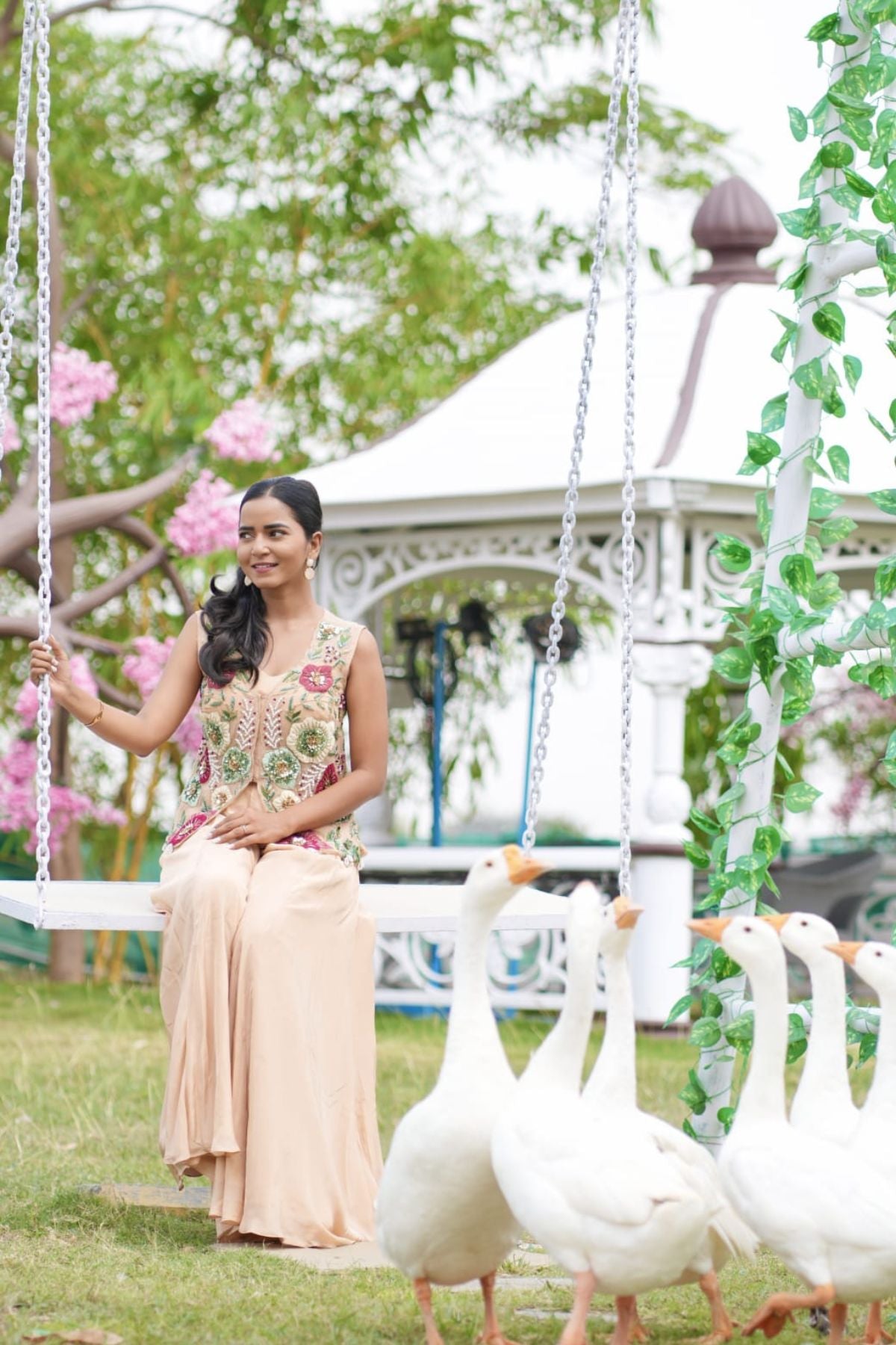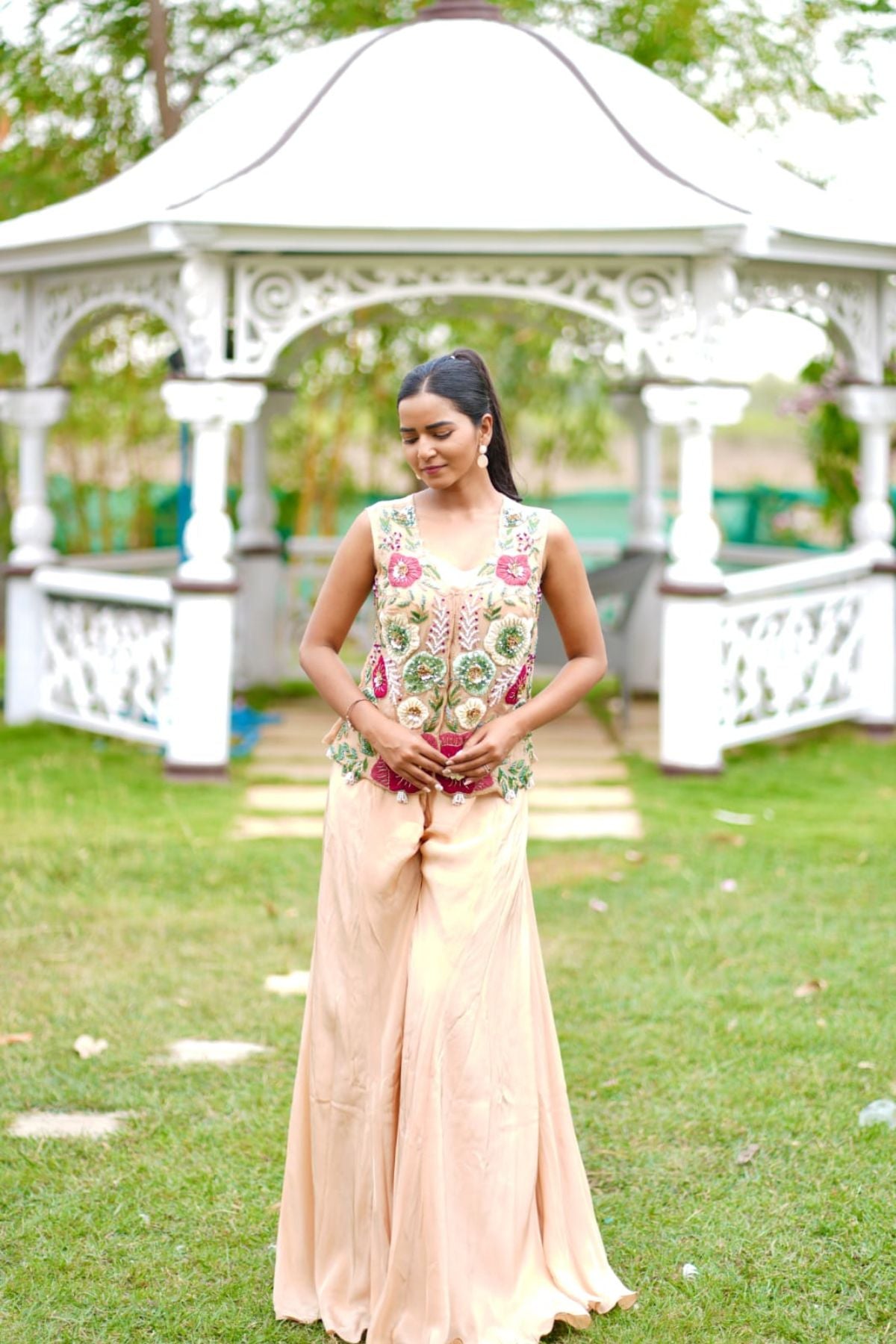 This designer Indo-western outfit features a multicolor embroidered short kurta paired with flared pants. The playful silhouette, vibrant detailing, and modern cut make it perfect for mehendi functions, festive gatherings, or intimate celebrations.