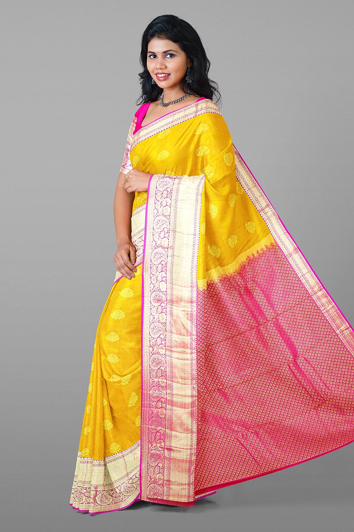 MUSTARD and PINK BUTTIS SILK BLEND Saree with SEMI PATTU