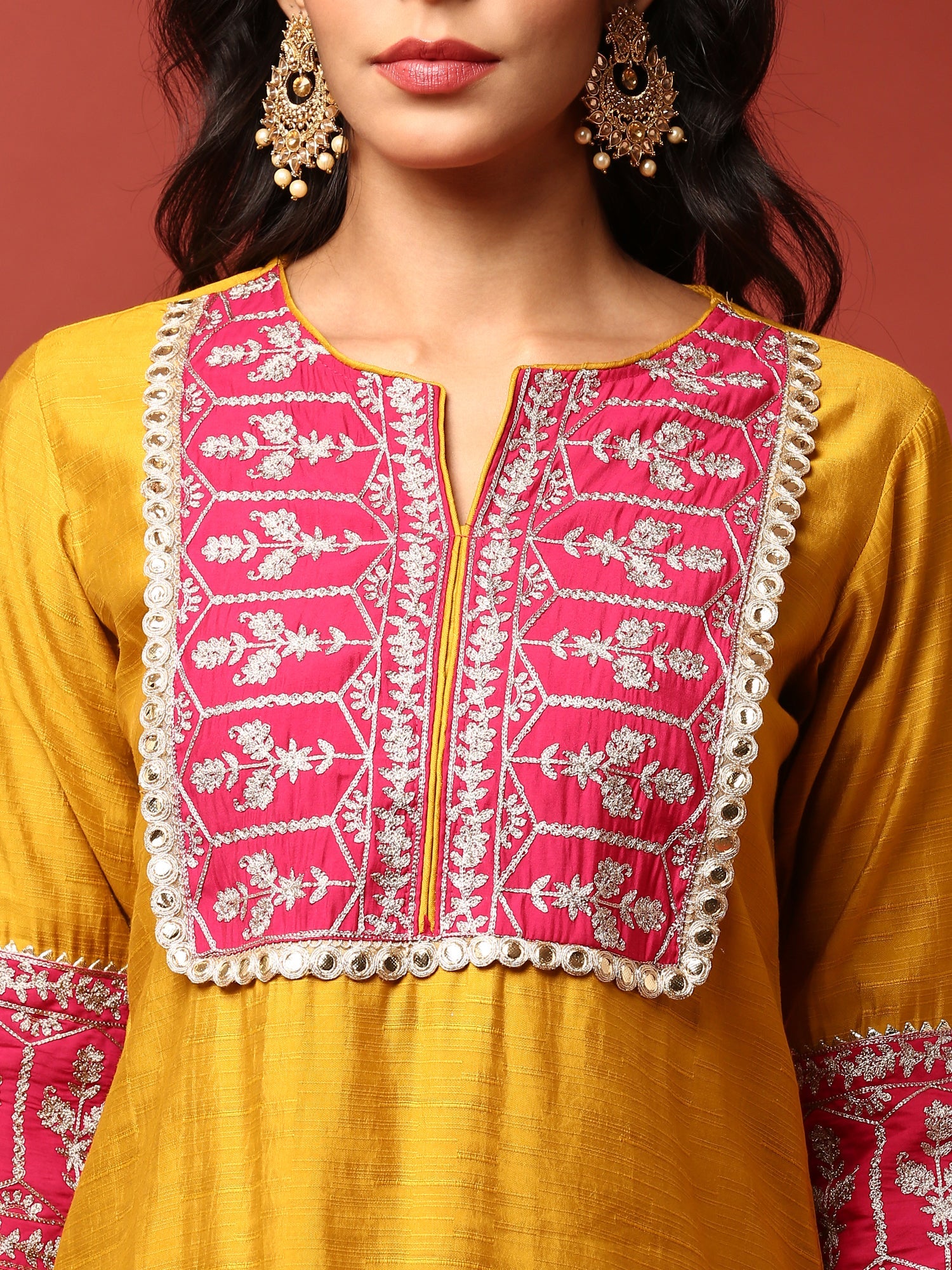 Mustard and Pink Silk Fabric Aari embriodery two piece cord set