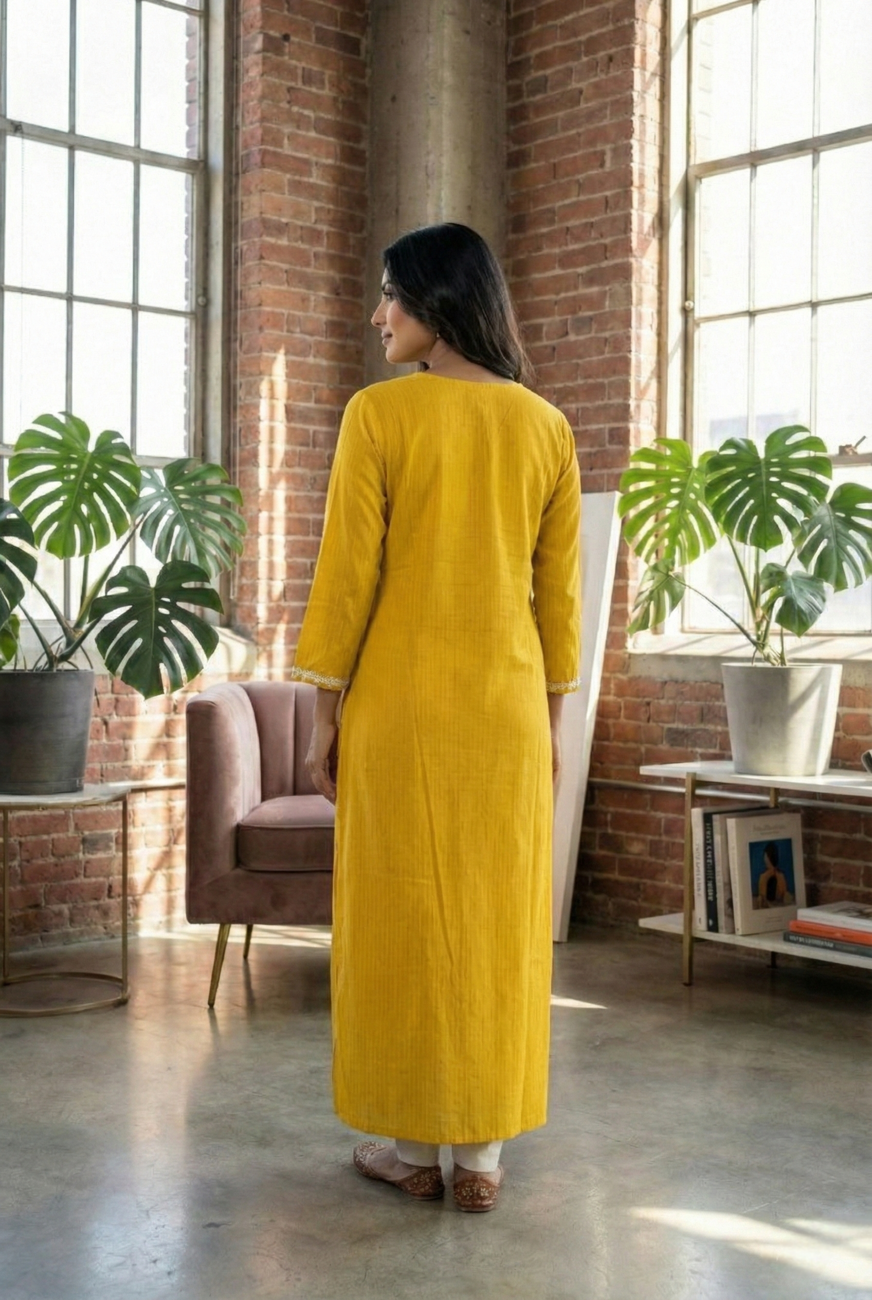 Elevate your ethnic wardrobe with this sophisticated mustard rayon kurta, meticulously crafted with intricate hand embroidery. The rich, warm mustard hue complements all skin tones, while the fluid rayon fabric drapes beautifully for effortless comfort. Each embroidered detail is a testament to traditional artisanal craftsmanship, making this piece a timeless addition to your collection. Perfect for festive occasions, cultural celebrations, or refined everyday wear, this kurta seamlessly blends heritage elegance with contemporary style.