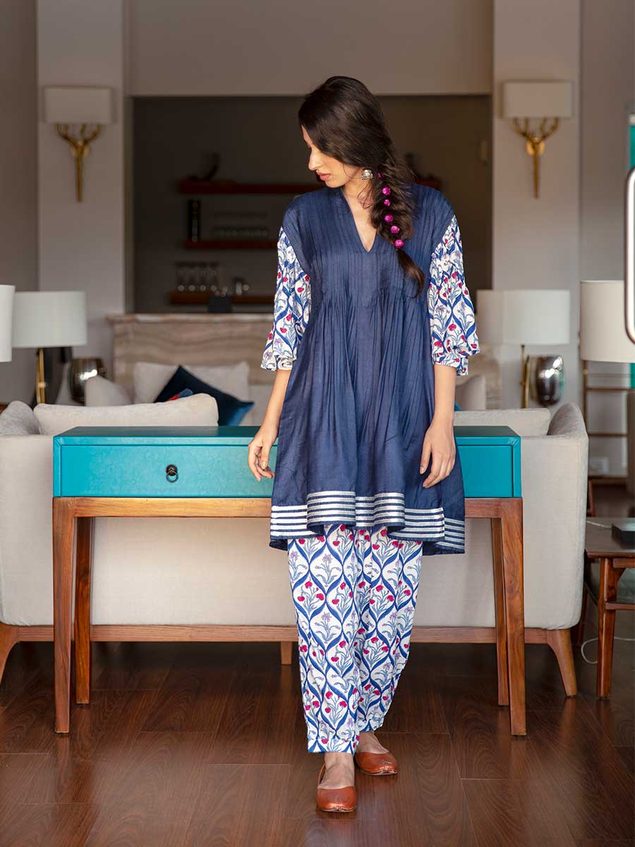 A flared short silk pintuck dress kurta crafted using traditional hand block print technique. The kurta features dense pintucks across the bodice and sleeves, and includes lace detailing to accentuate the design. Combine this with some silver or gold jewellery and kolhapuris to complete the look. Our model is 5'6" and is wearing S.