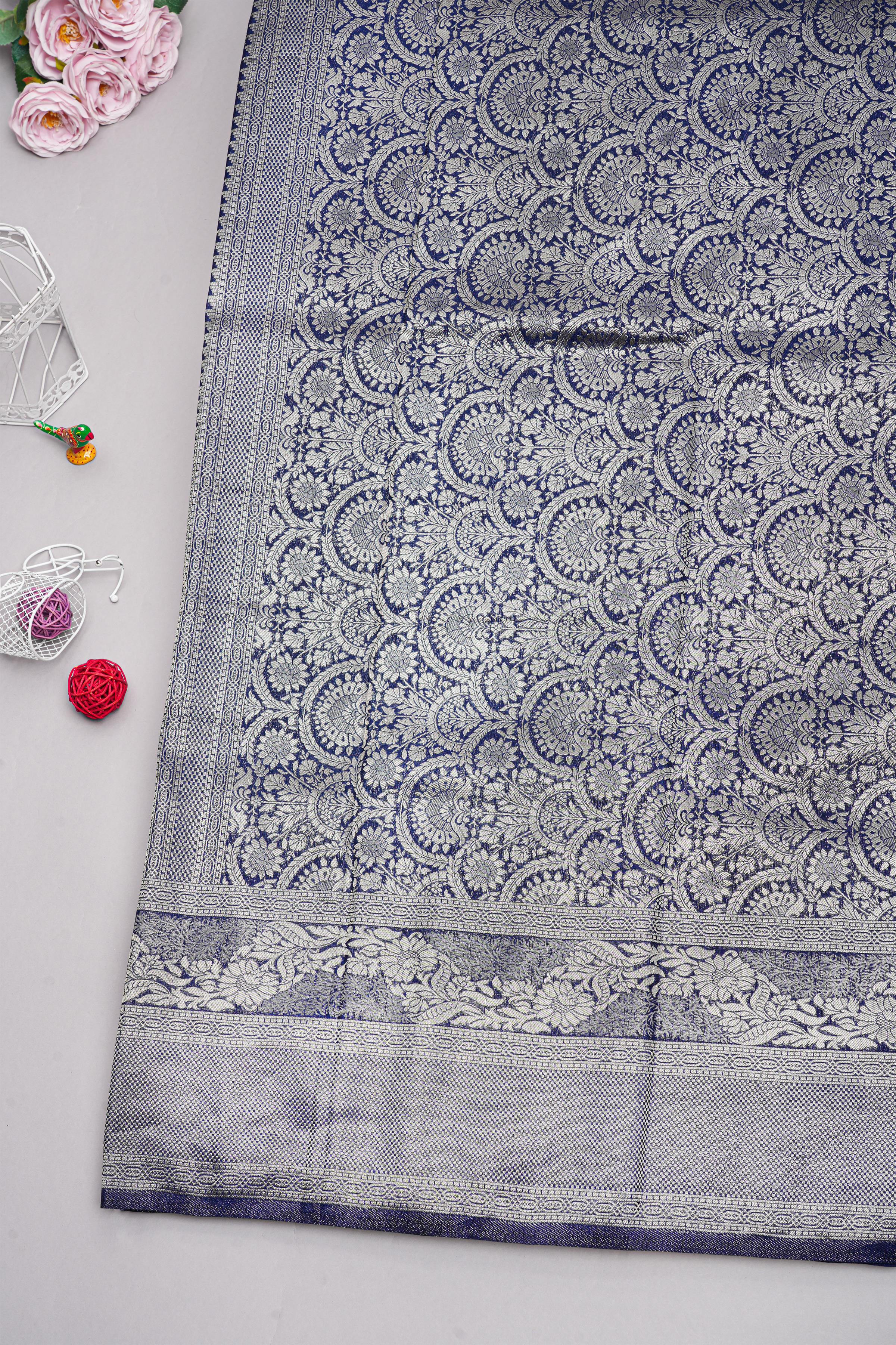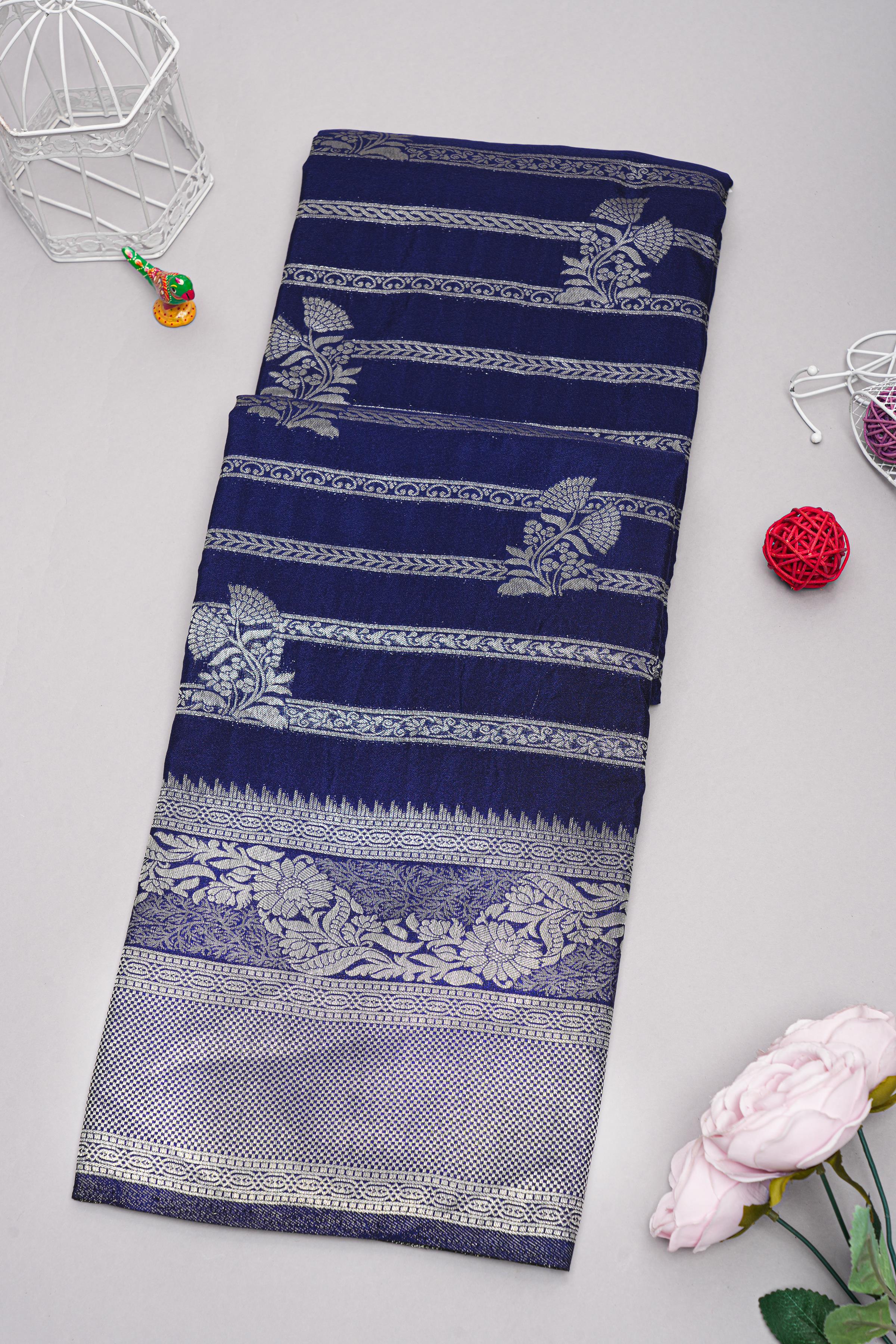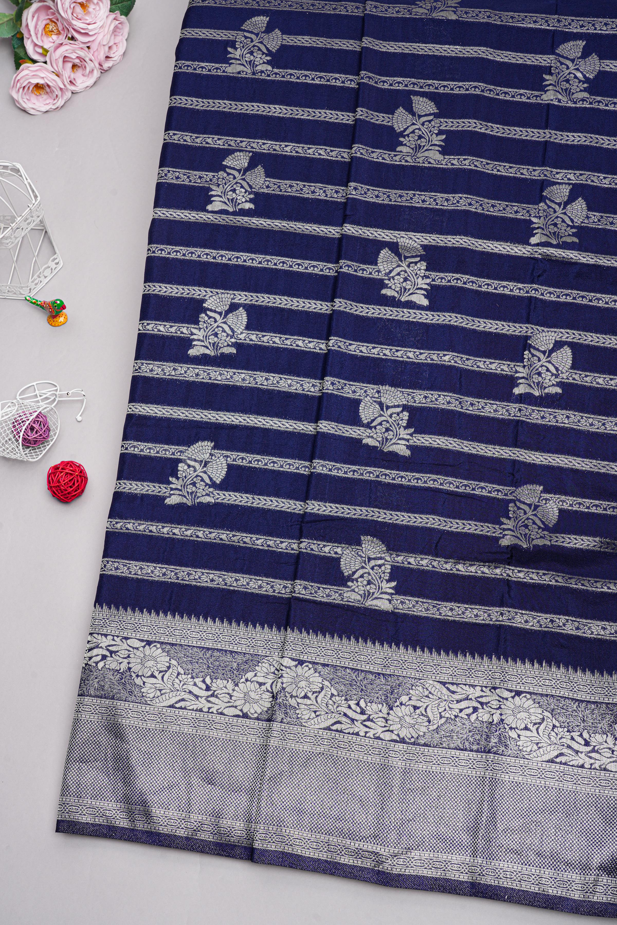 Latest NAVY BLUE FLORALS SILK Saree with ZARI border. This saree comes with PLAIN WITH BORDER SILK blouse.