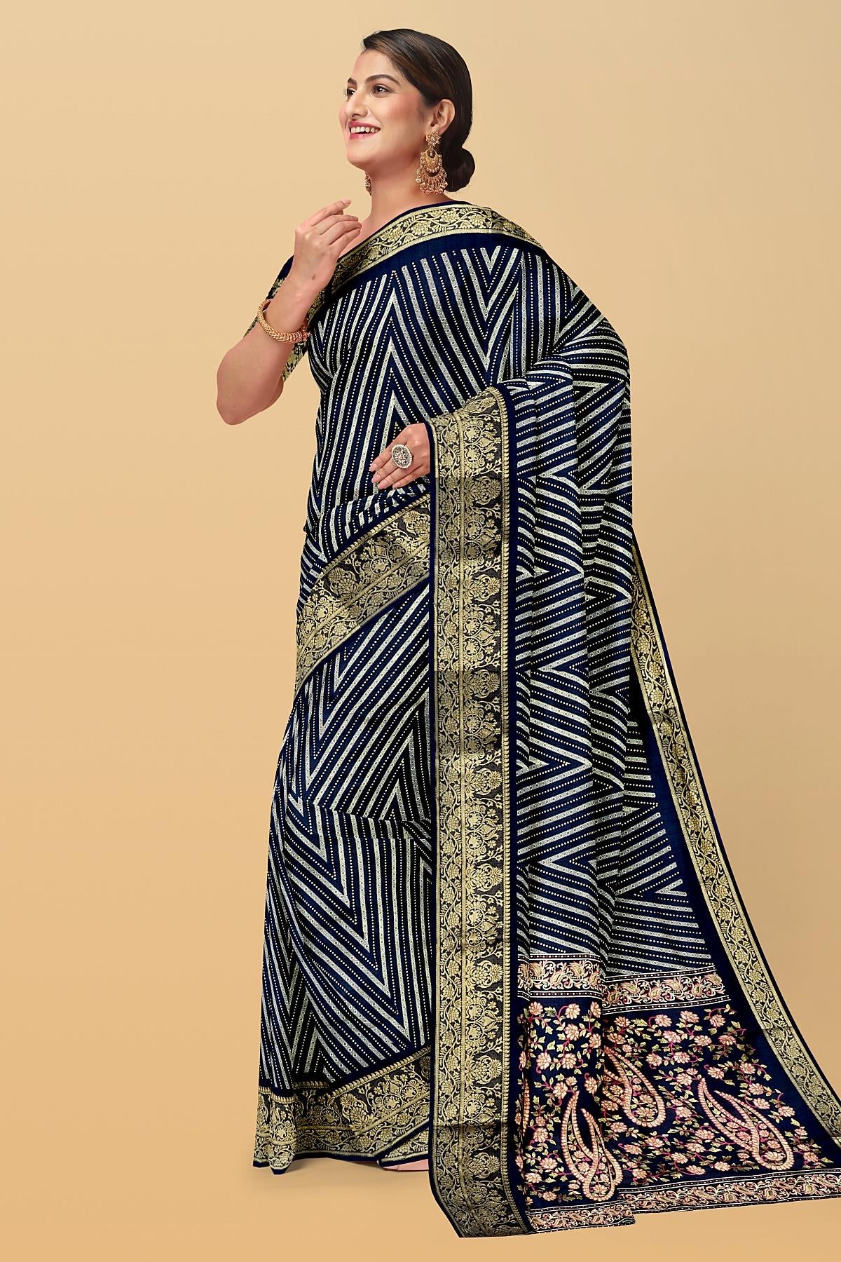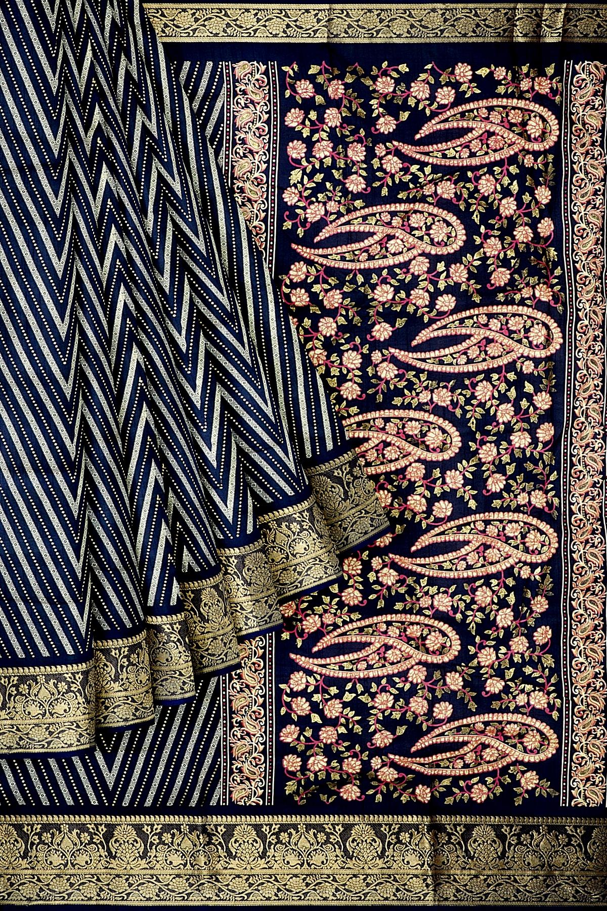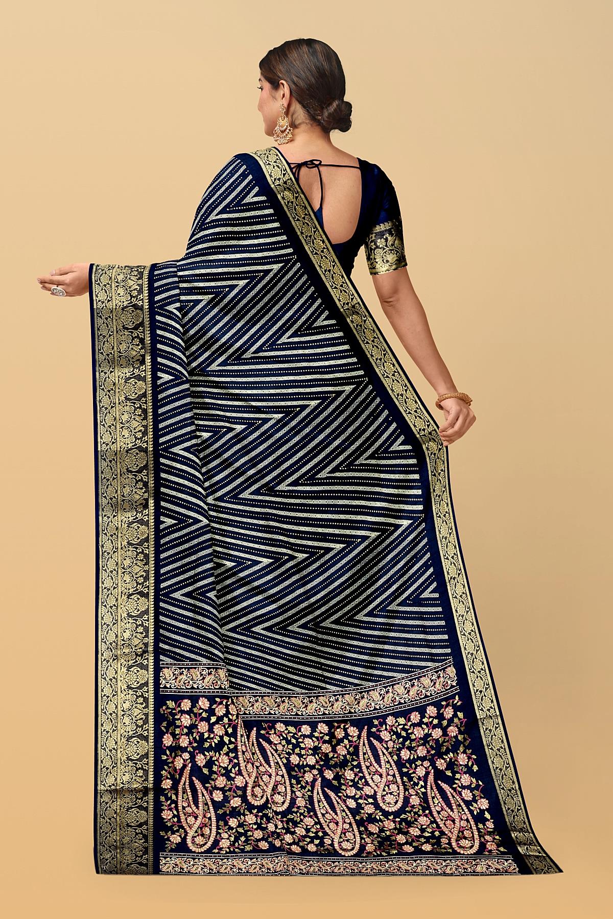 Latest NAVY BLUE ZIG ZAG SILK BLEND Saree with ZARI border. This saree comes with PLAIN WITH BORDER SILK BLEND blouse.