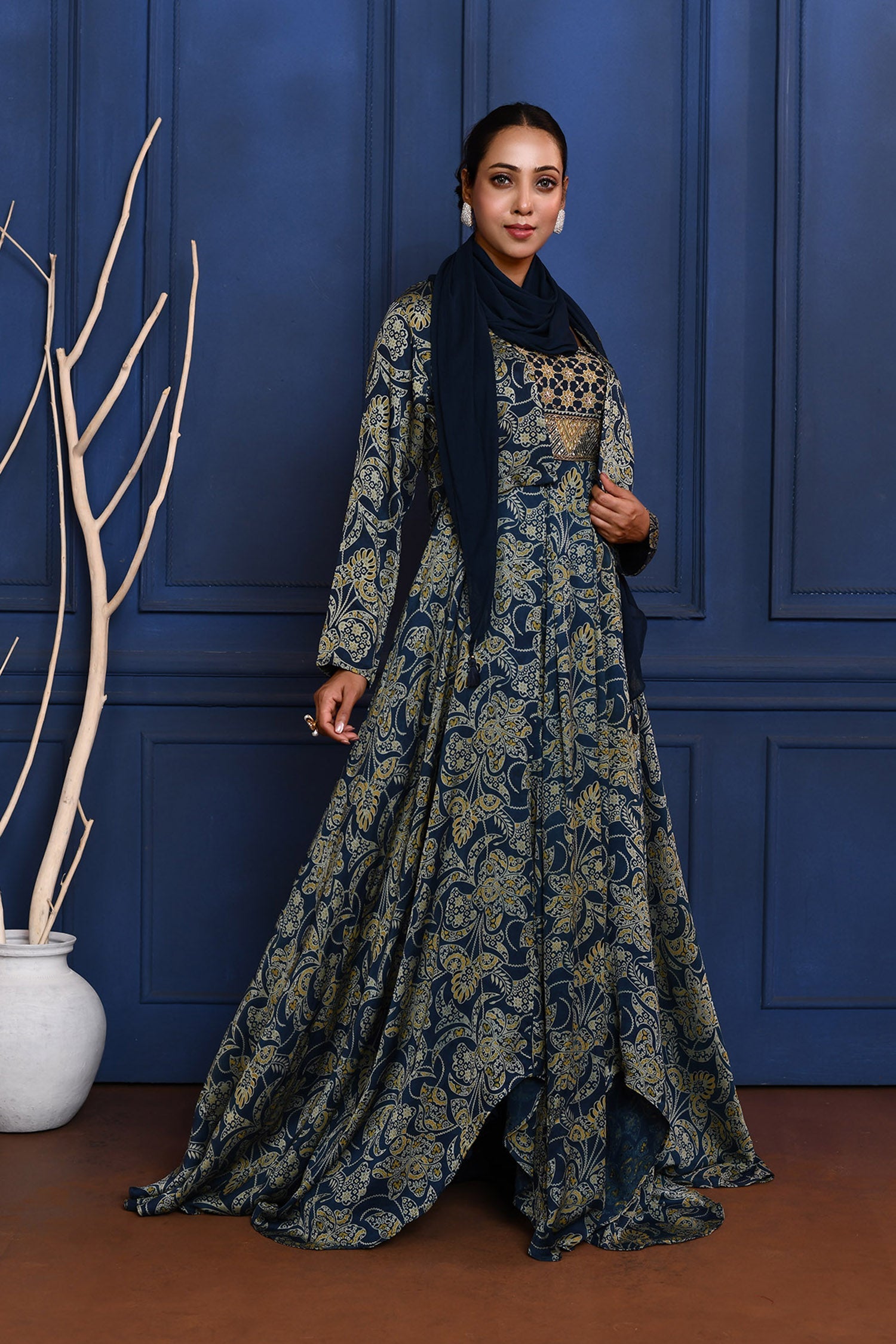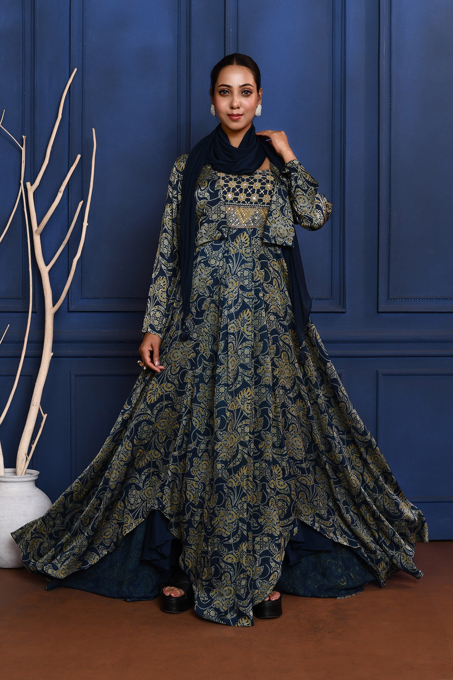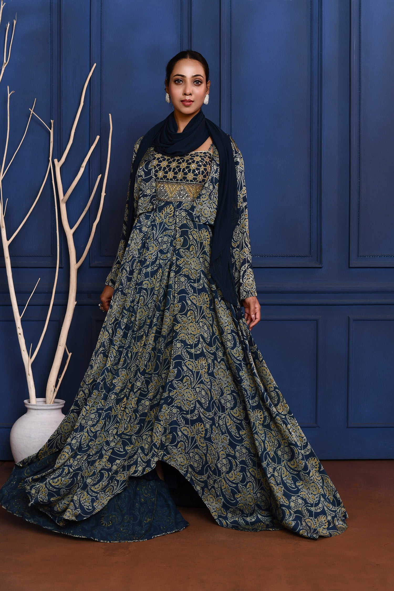 The navy blue floral printed satin anarkali set with matching short jacket and georgette dupatta for a blend of traditional look with modern elegance.