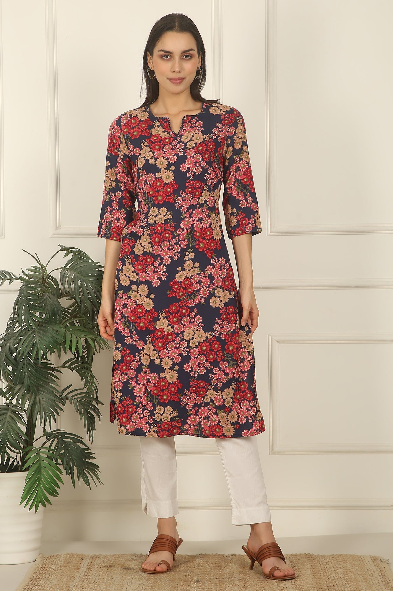 Elevate your ethnic wear game with this striking Navy Blue Floral Printed Textured Cotton Kurta. Featuring a rich combination of red, beige, and pink floral motifs, this kurta brings timeless charm to your everyday style. The straight silhouette and notched round neckline offer a classic touch, while the three-quarter sleeves make it versatile for both workwear and casual settings. Crafted from soft, breathable cotton, this kurta guarantees all-day comfort. Pair it with white trousers and statement earrings for a polished, graceful ensemble.