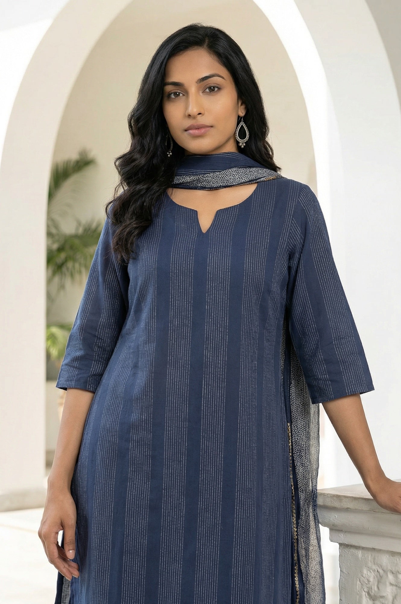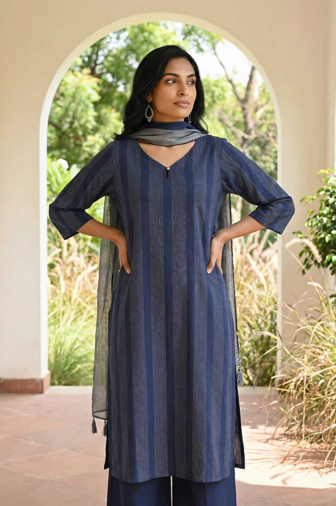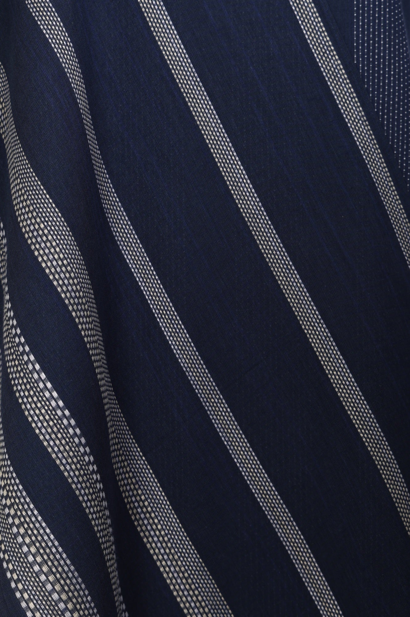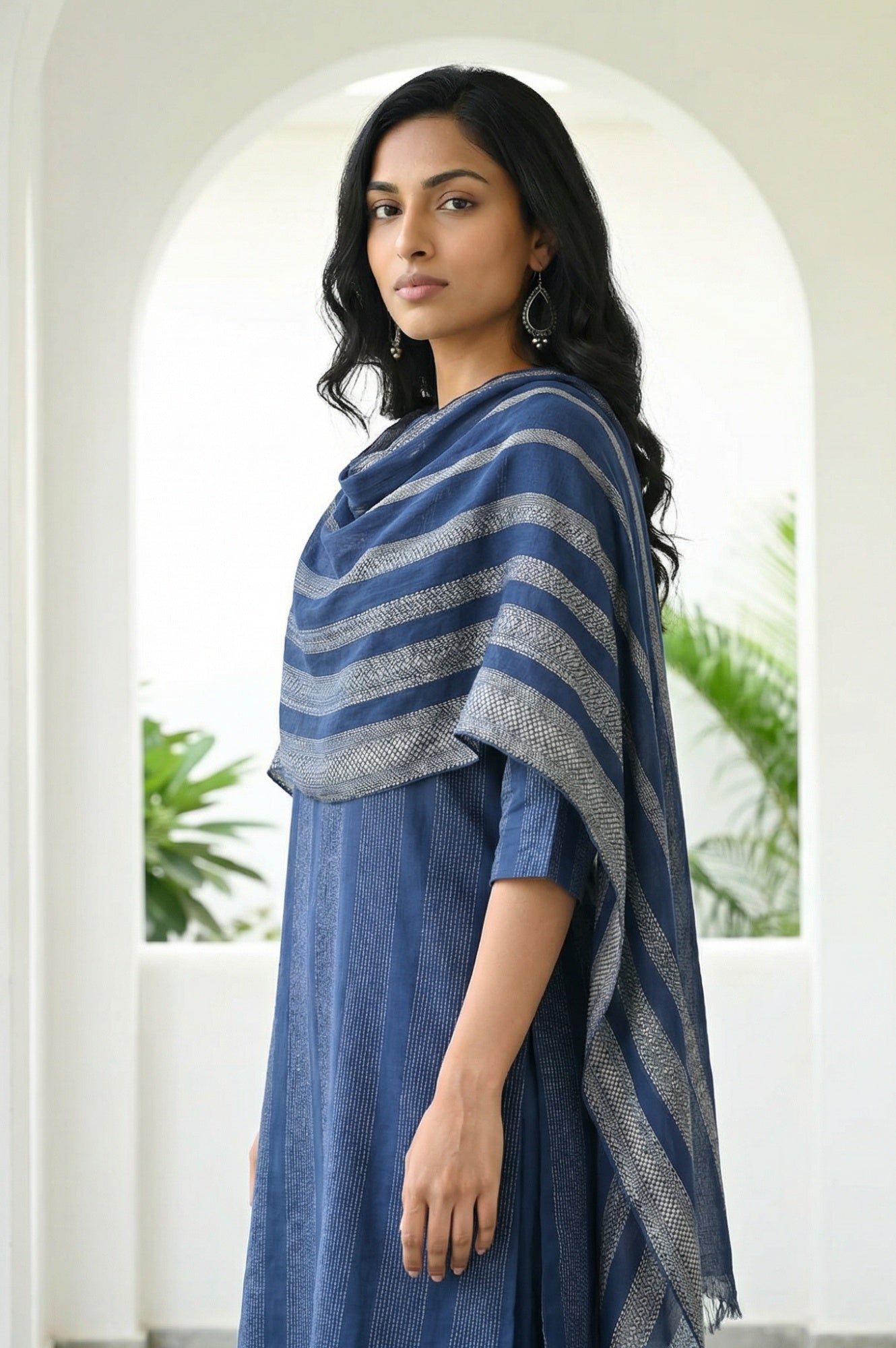 Define your daily ethnic style with this Aurelia navy blue cotton stole, a perfect blend of utility and grace. Woven from 100% pure cotton, this breathable accessory features sophisticated silver yarn-dyed stripes that offer a subtle sheen for workwear or casual outings. The soft, lightweight fabric of this dupatta for women ensures all-day comfort during summer, draping effortlessly over a printed kurta set for women or a solid tunic. Finished with delicate thread work details, this opaque rectangular scarf serves as a versatile staple in Indian ethnic wear. Style it with silver jewellery to complement the metallic accents for a polished, contemporary look.
