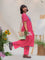The pink cotton kurta is finished with a contrast hand-embroidered floral yoke - soft, detailed, and quietly expressive. It has a classic round neck, short sleeves with scalloped edges, and pockets on both sides for everyday ease. The matching pink cotton pants complete the set with a scalloped hem, elasticated waist, and side pockets.