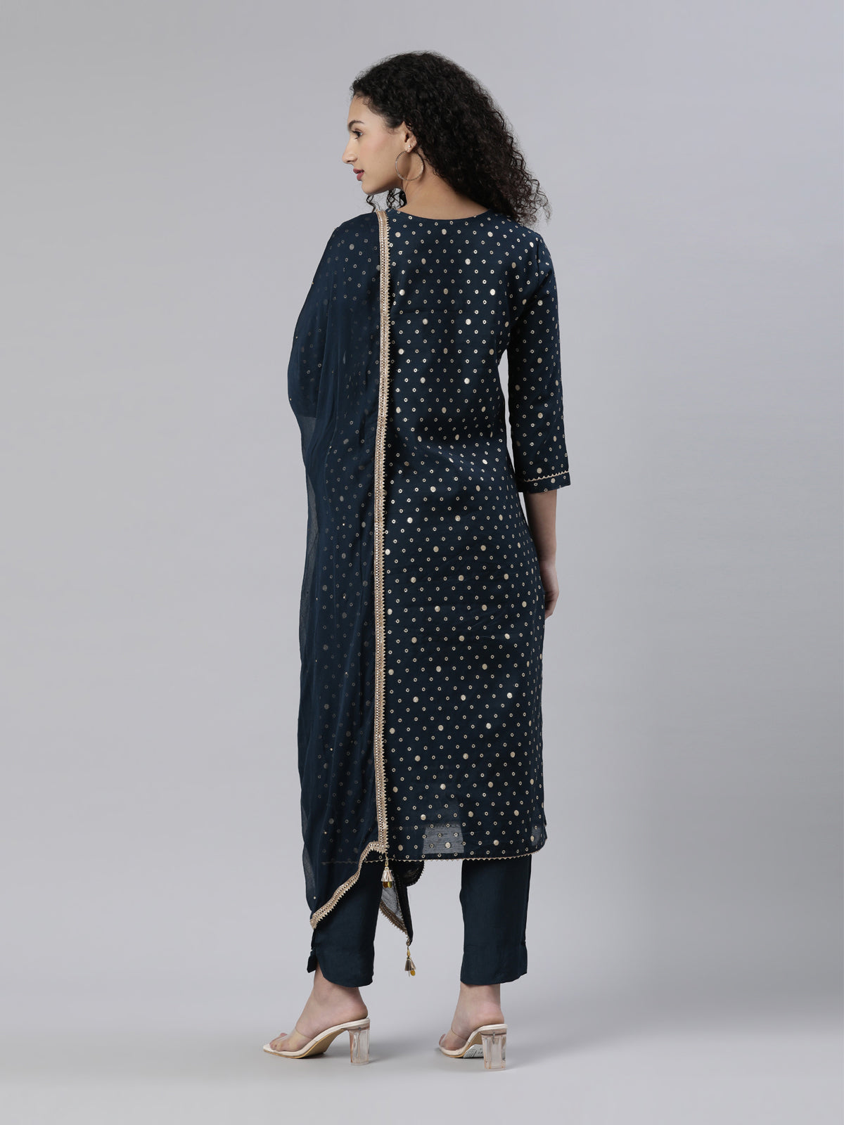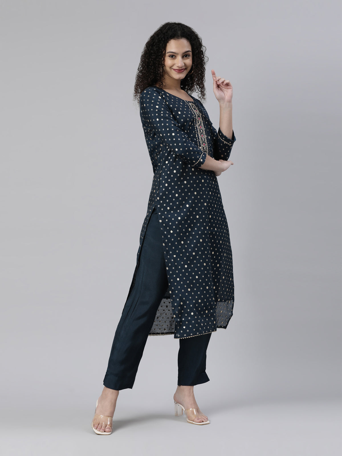 Crafted With A Captivating Blend Of Exceptional Prints And Lush Fabric, Neeru's Blue Regular Knee Length Readymade Suits Is An Embodiment Of Luxurious Sensibility And Sophistication. Along With A Solid-Hued Trousers, This Ensemble Is Complete With A Delicate Dupatta For A Stunning Appeal.