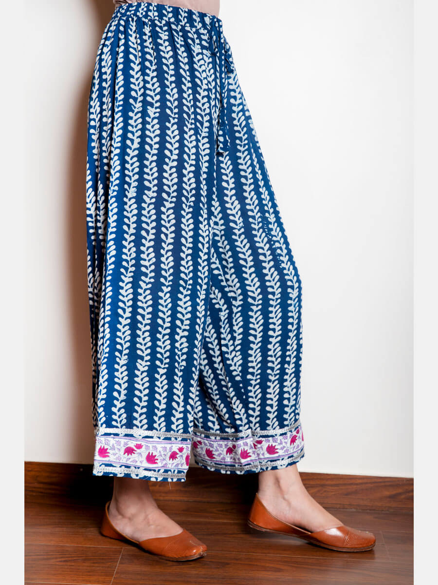 A comfortable palazzo pant handcrafted in modal using traditional dabu printing; perfect for pairing with long shirts, kurtas, and kaftans. Be at your comfortable and stylish best!