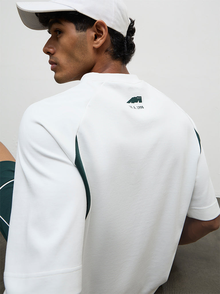 Nuoflexx presents this off-white T-shirt showcasing a minimal text design and bold stripes running along the sides for a sporty finish. A crew neckline and raglan sleeves adds to its laid-back appeal. It is sculpted from a cotton blend fabric in a relaxed fit, ensuring lasting comfort through workouts and active days.
