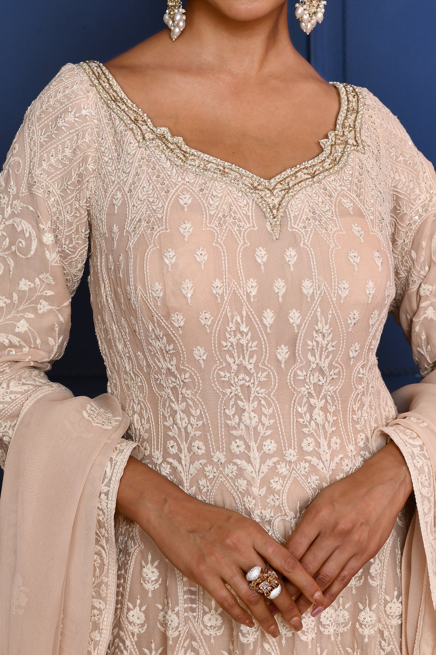 The off-white embroidered georgette anarkali set with floral thread embroidery with matching dupatta for a graceful look with elegance.