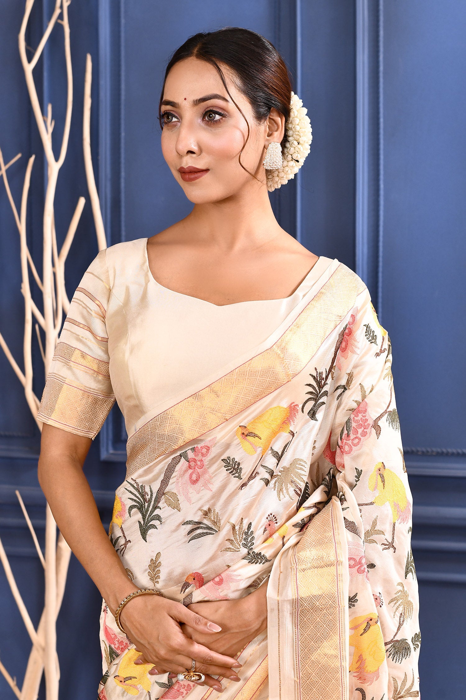 The off-white silk saree with floral and bird embroidery and woven zari border along with matching blouse for a graceful traditional look.