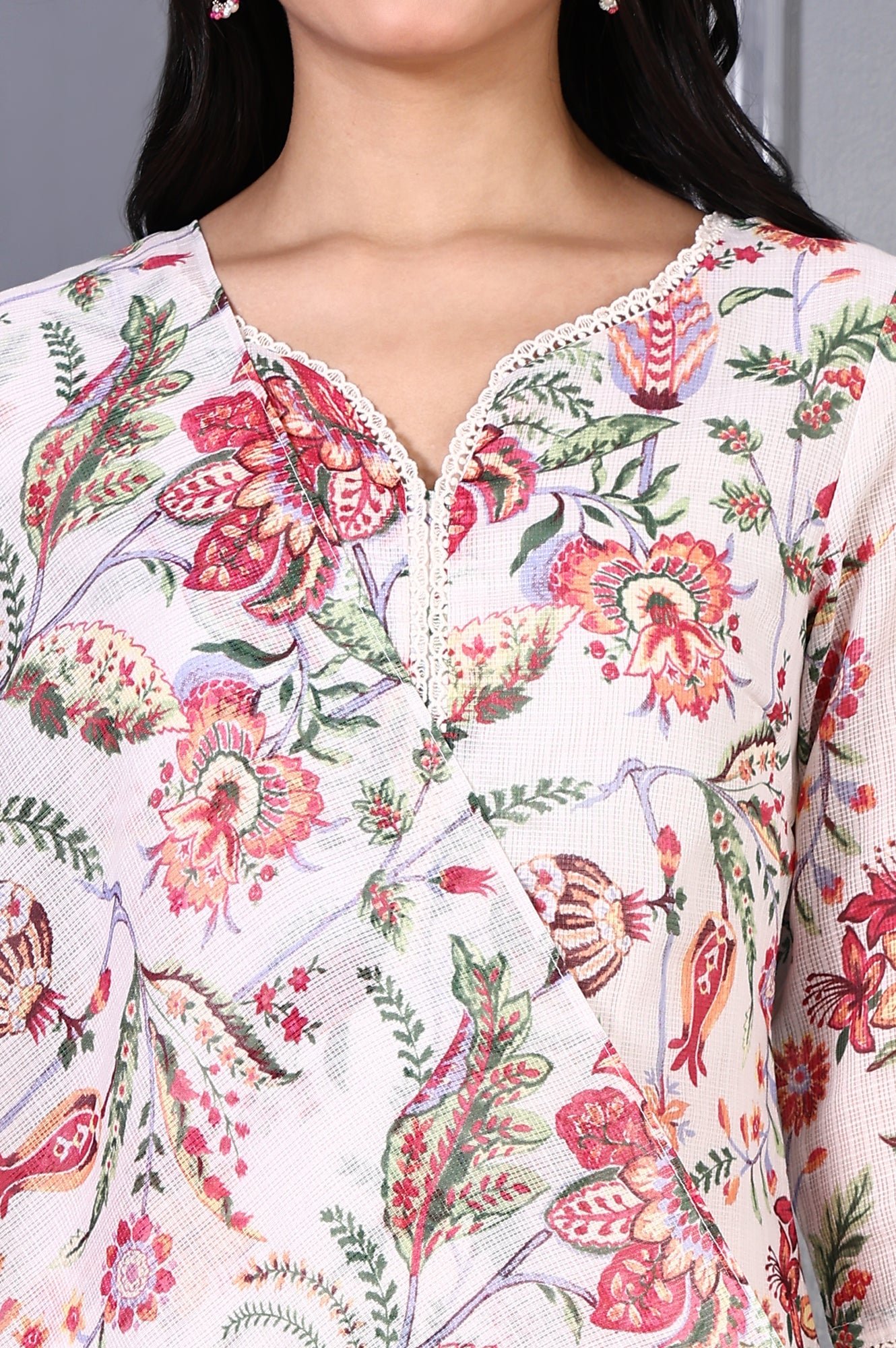 Effortlessly fresh, this off-white floral printed kurta set in Kota fabric brings breathability and elegance together. The straight kurta is paired with matching pants and a dupatta for a coordinated look. The light floral prints evoke a seasonal charm ideal for spring and festive wear. Kota’s textured fabric adds richness while keeping things light, perfect for longer events.
