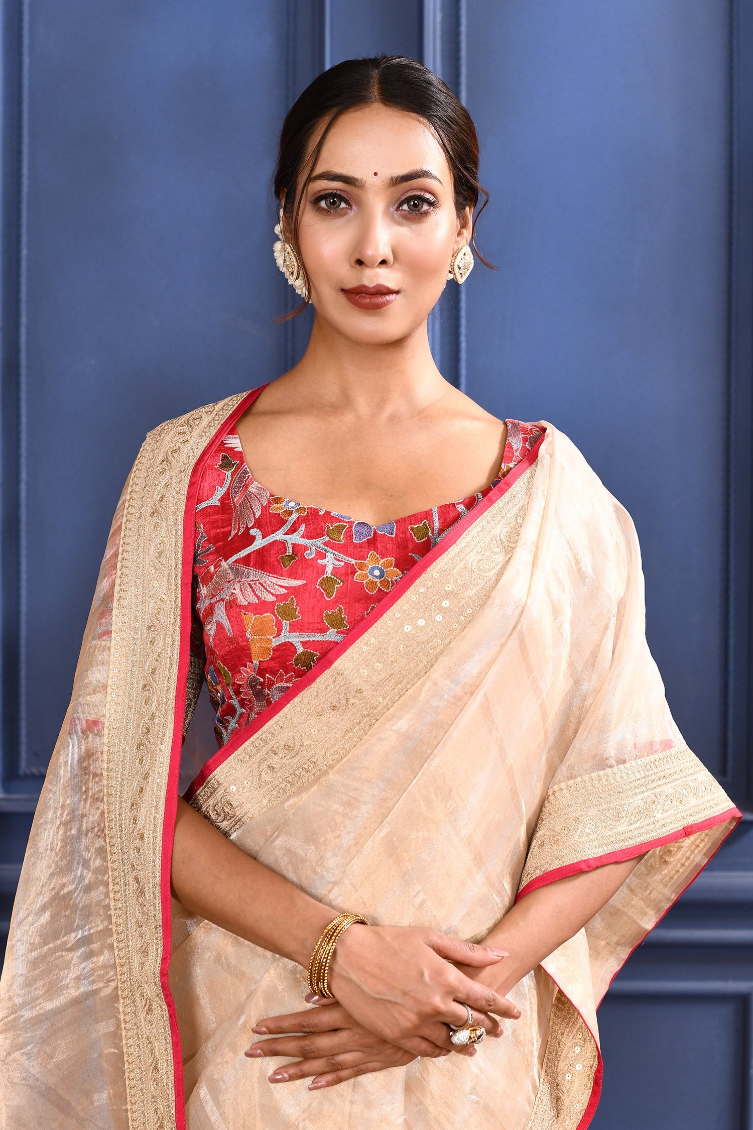 The pale cream embroidered tissue saree with border highlight and stitched embroidered red blouse for a stylish look with traditional elegance.