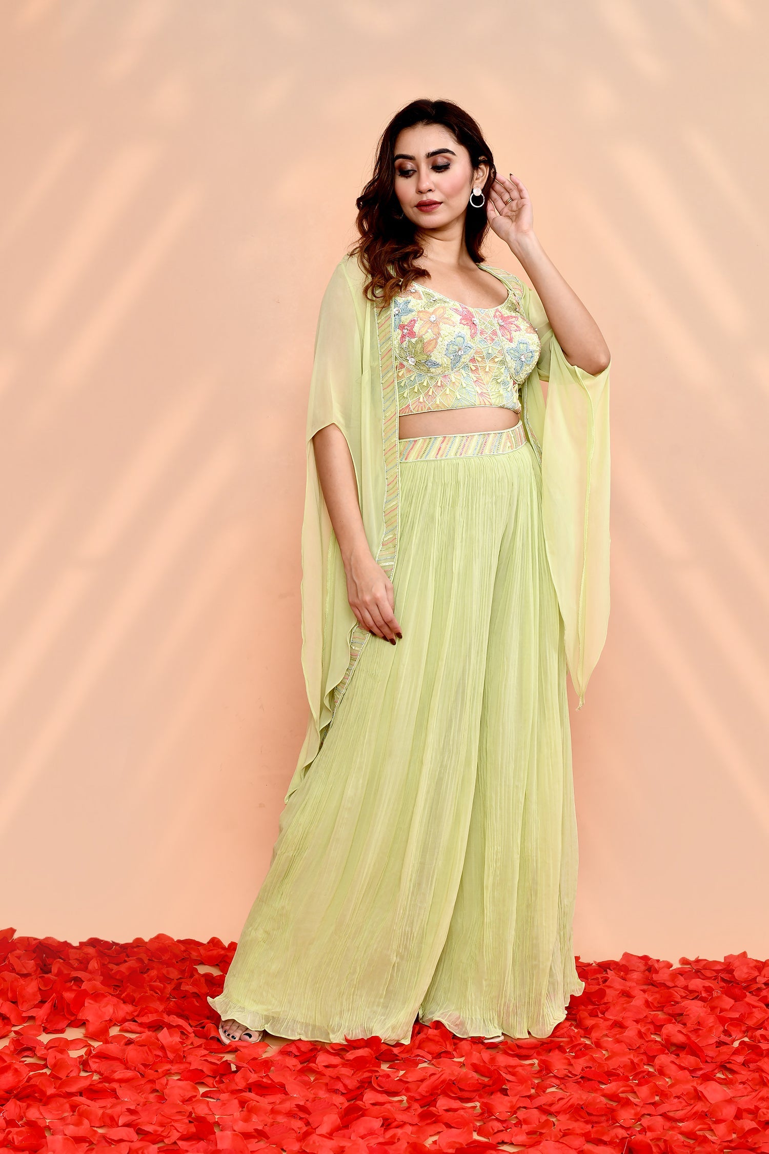 The pale green chinon georgette indo-western set with floral embroidered blouse and matching solid palazzo with dupatta for a stylish ethnic look.