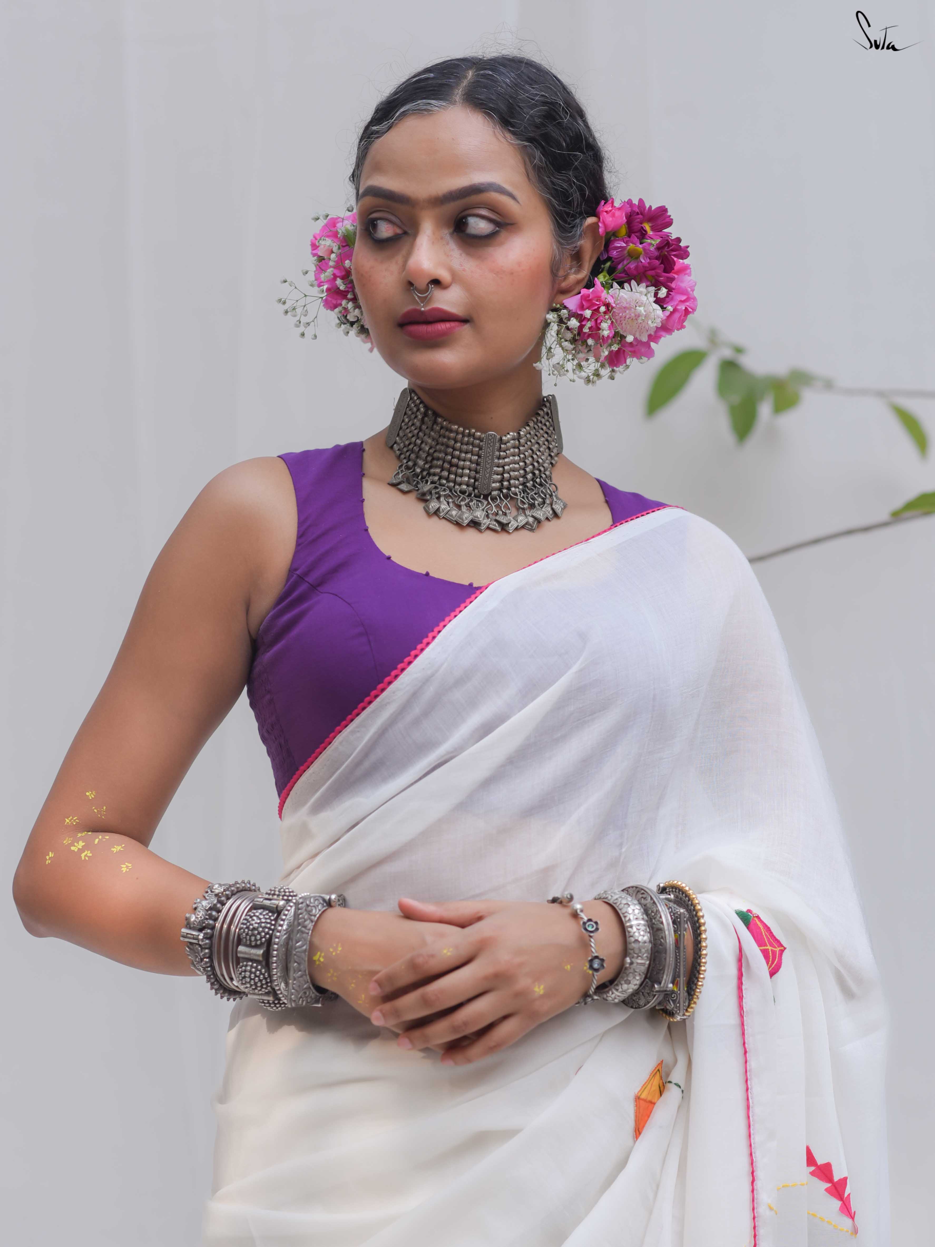 Playful, bright, and full of sky-bound dreams, this saree celebrates the joy of Basant through hand-appliqued kites in a burst of colours. The soft drape feels effortless, while the crochet lace and tassels add a sweet festive charm, like patangs dancing in a spring breeze.