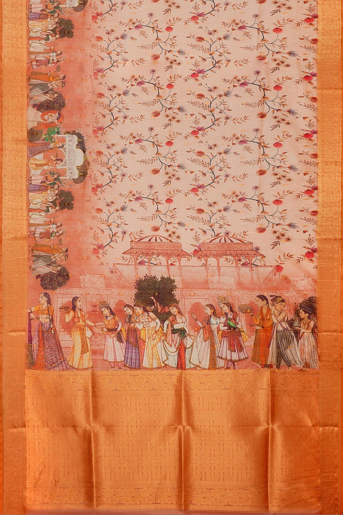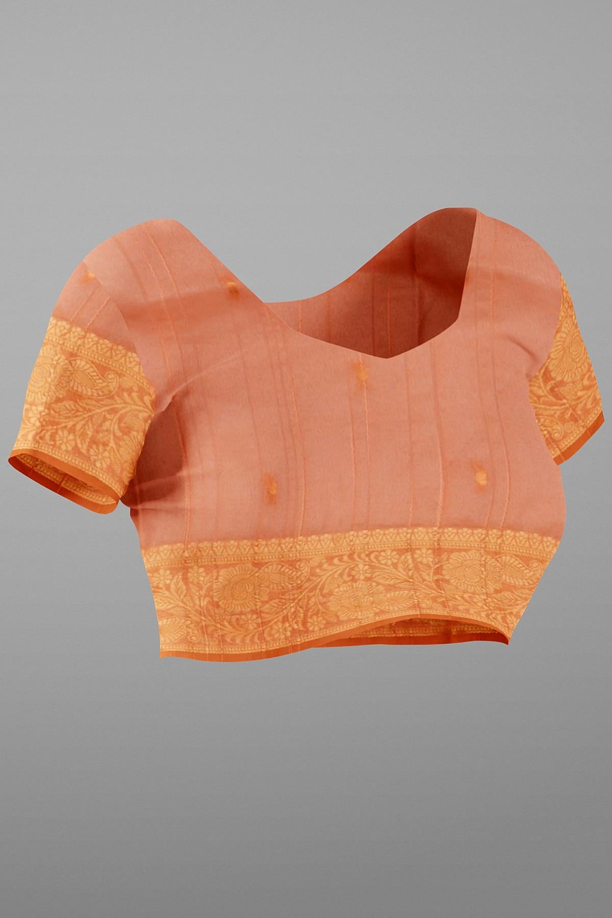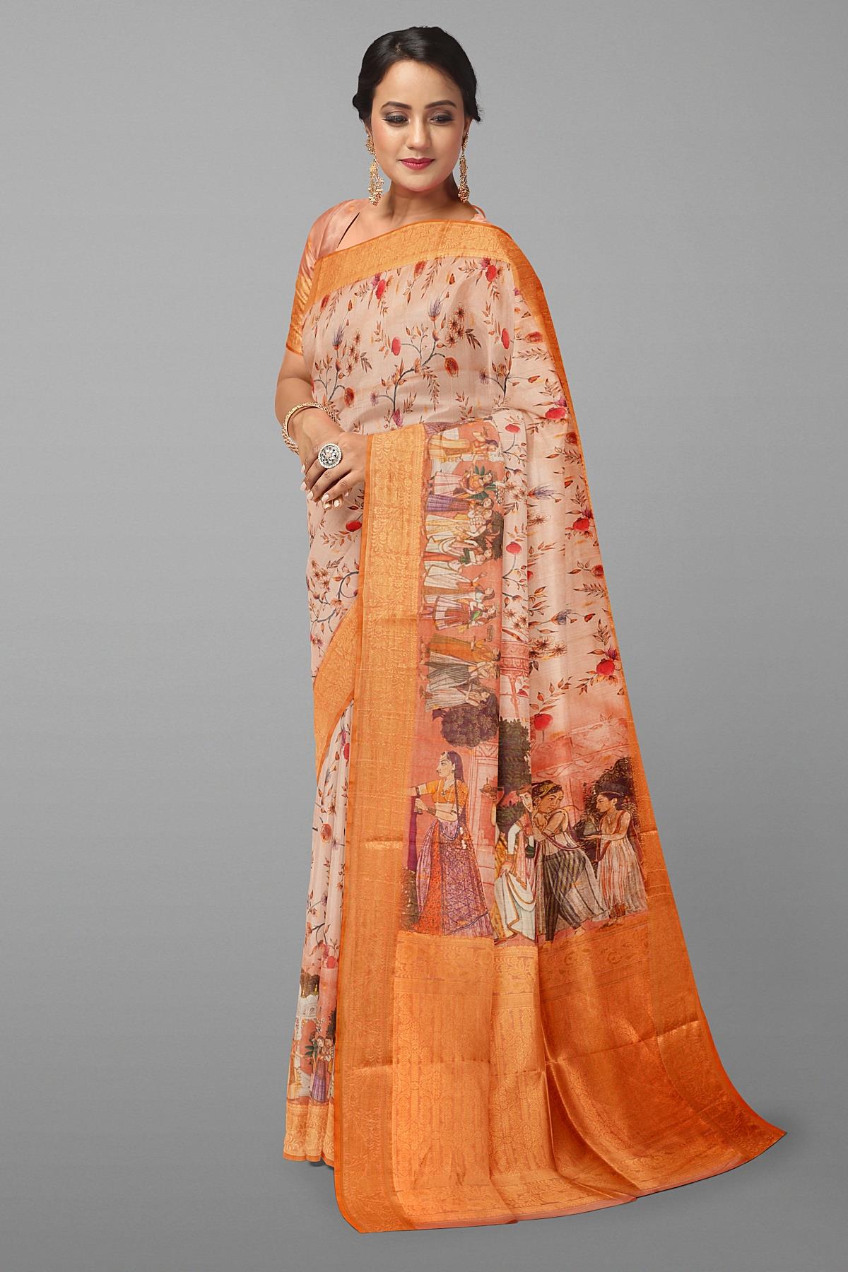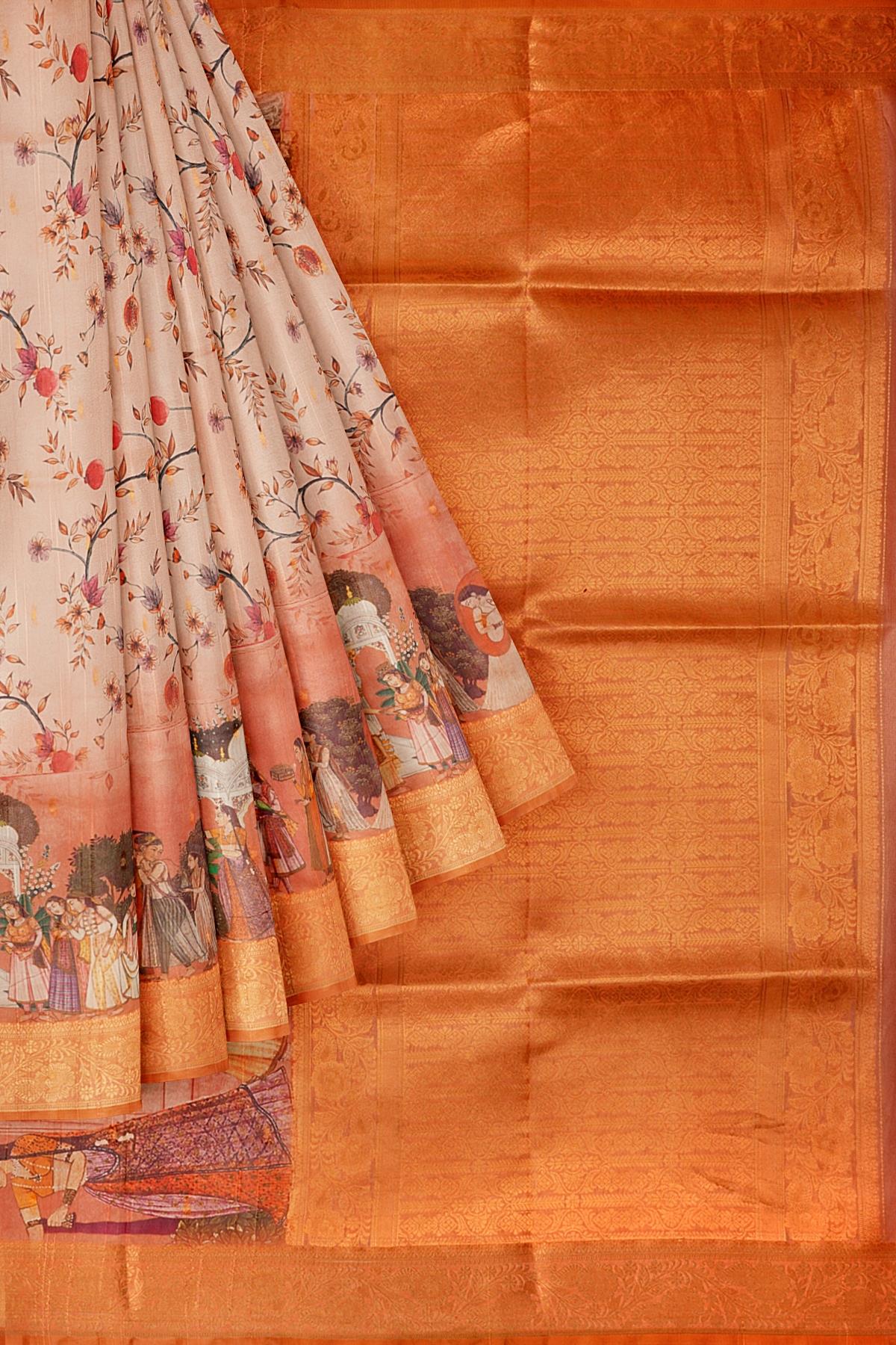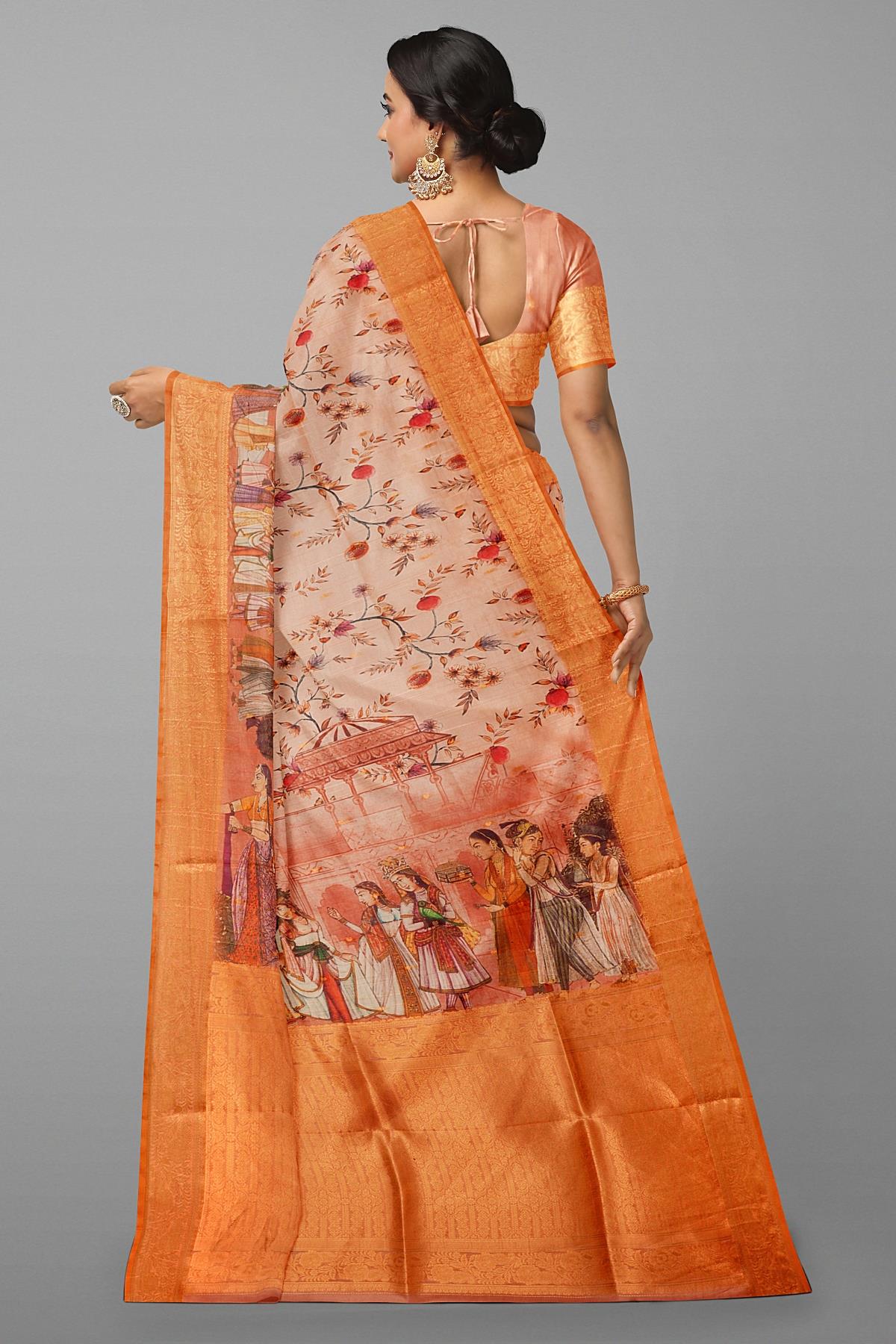 Latest PEACH FLORALS SILK Saree with ZARI border. This saree comes with CONTRAST WITH BORDER SILK blouse.