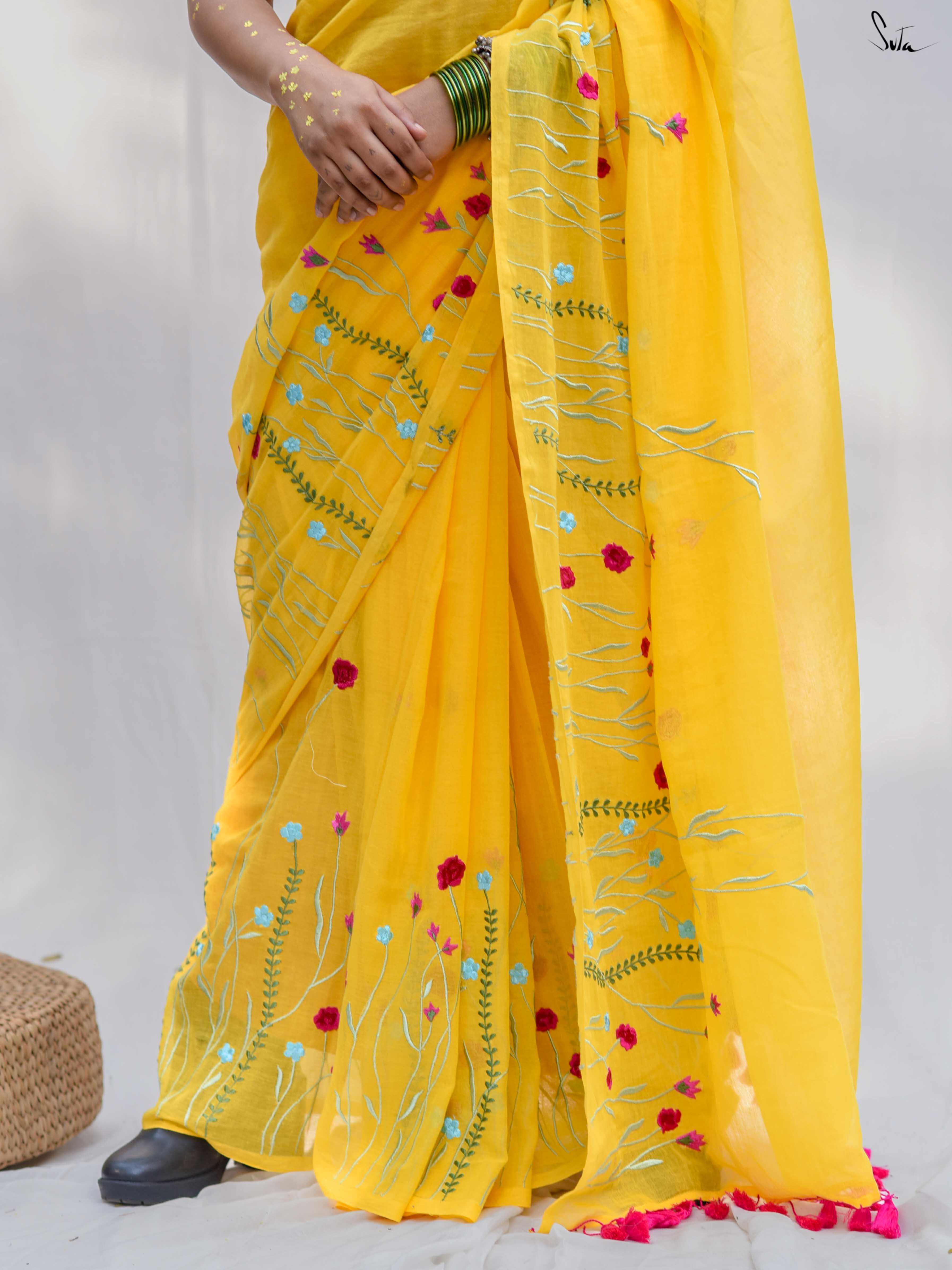 Soft, sunny, and full of gentle warmth, this saree captures the heart of Basant in its delicate embroidered florals. The mul cotton drape is feather-light and breathable, while the pink crochet lace adds a sweet pop of contrast, like spring flowers blooming against golden light.