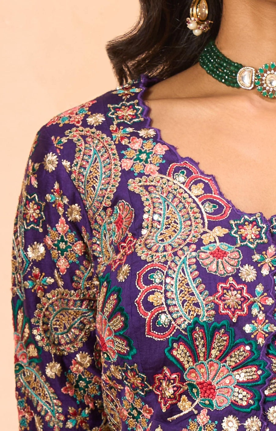 This purple Indo-Western ensemble features the signature Mrunal Rao pattern with vibrant multicolor thread work, creating a unique and artistic appeal. Paired with stylish chinnon fabric plazo pants, this outfit offers the perfect mix of traditional and contemporary elegance—ideal for festive functions, sangeet parties, and upscale events.