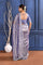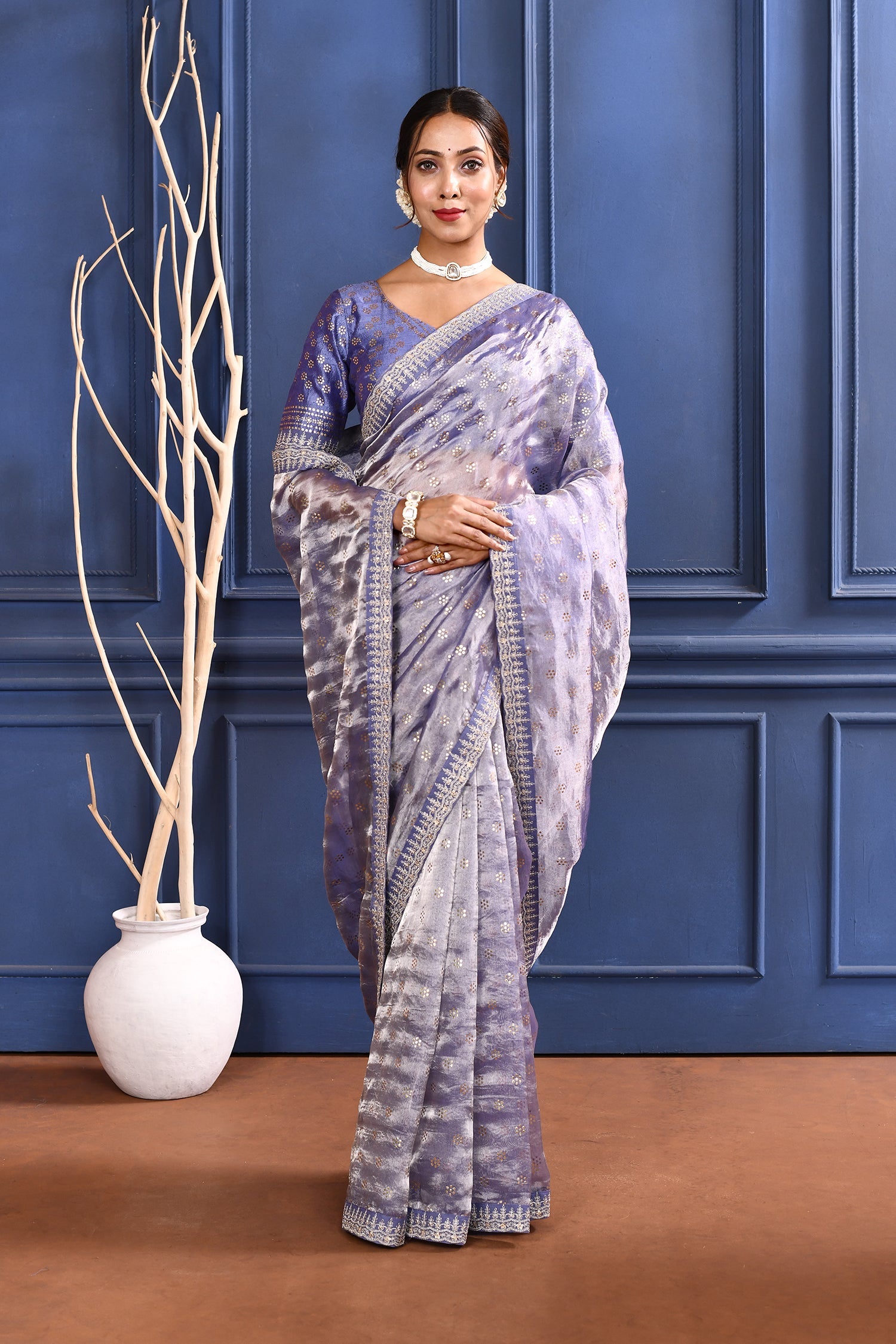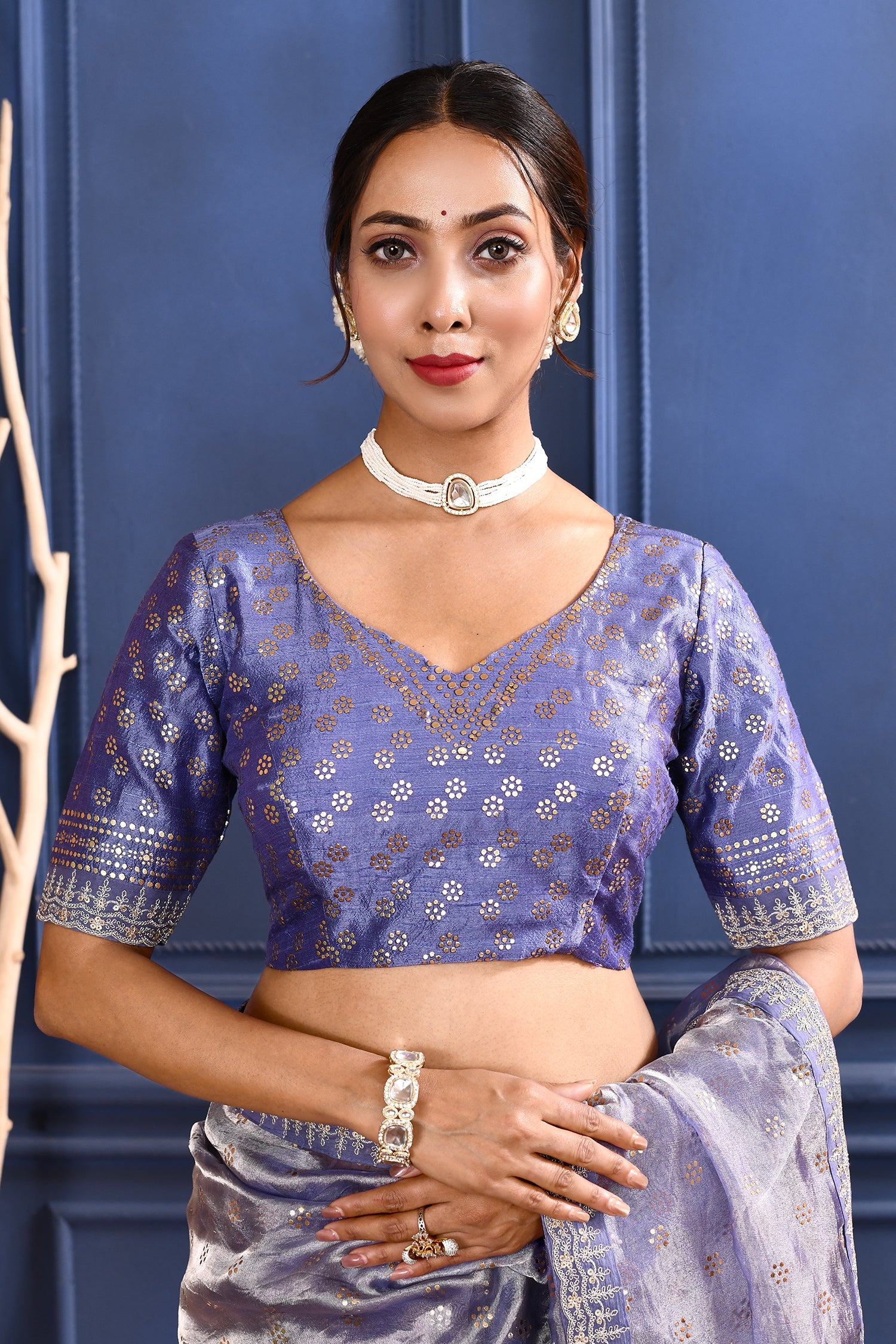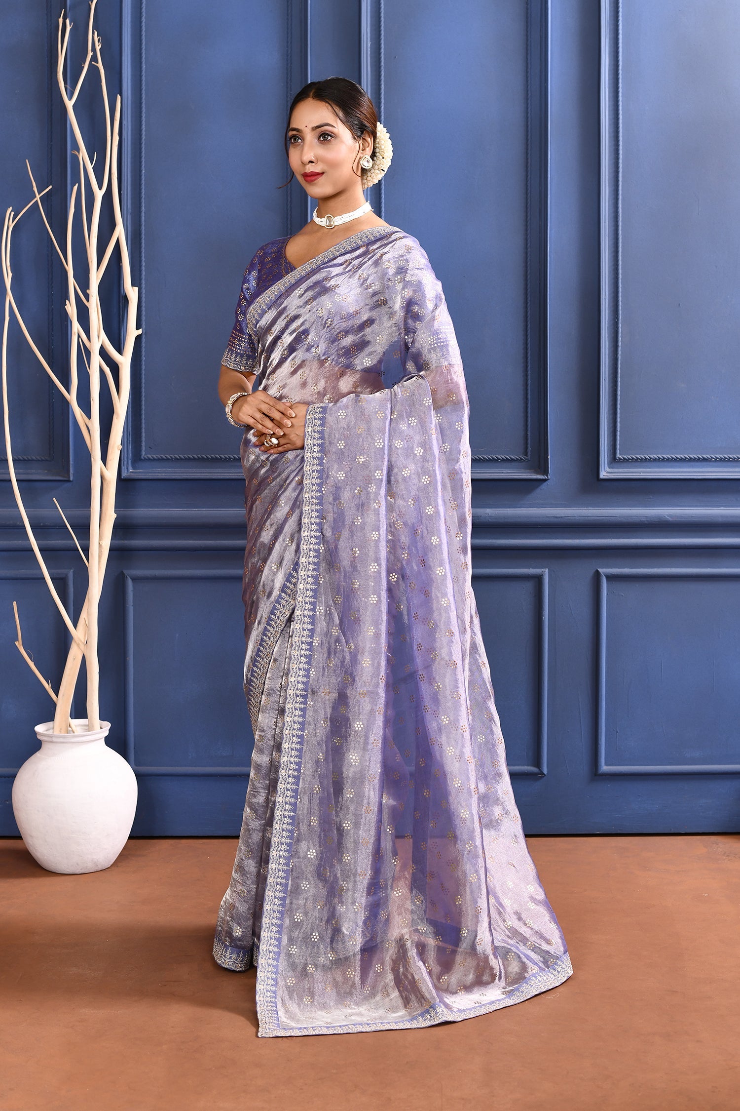 The rich purple tissue foil saree with embroidered border and stitched matching blouse for a classy shine with beautiful look.