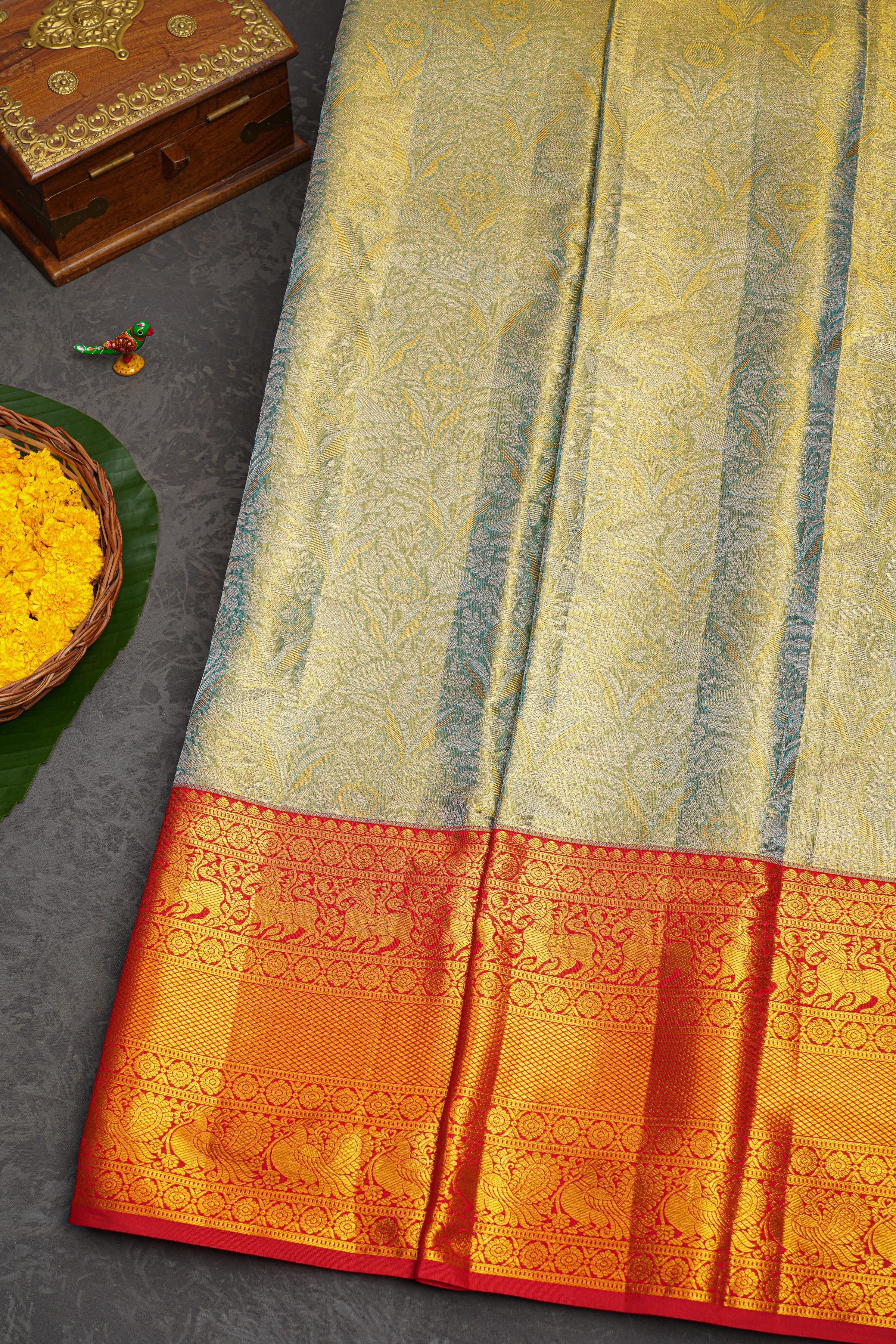 SEA BLUE and RED FLORAL JAAL SILK Saree with KANCHIPURAM