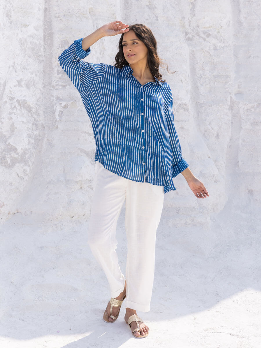 - A beautiful modal indigo shirt paired with white pants