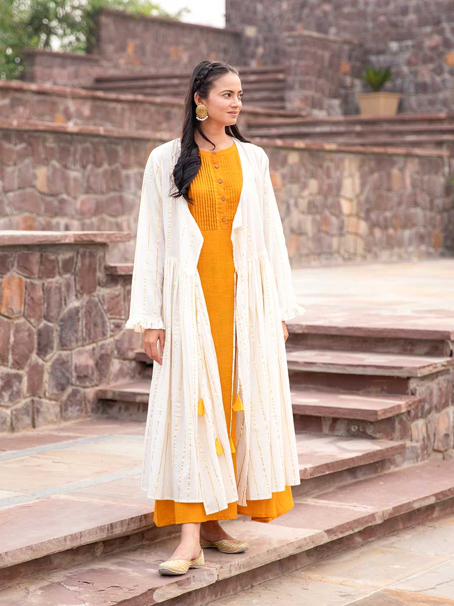 An A-line long cotton slub pintuck dress with handwoven cotton angrakha jacket featuring fine zari work and a dramatic flair. It can be left open or tied using the tassel strings provided on each side. Combine this with silver or oxidised jewellery and mojaris to complete the look. Both the dress and jacket can be used separately and styled in various ways. Our model is 5'8" and is wearing S. Note: Ships immediately.