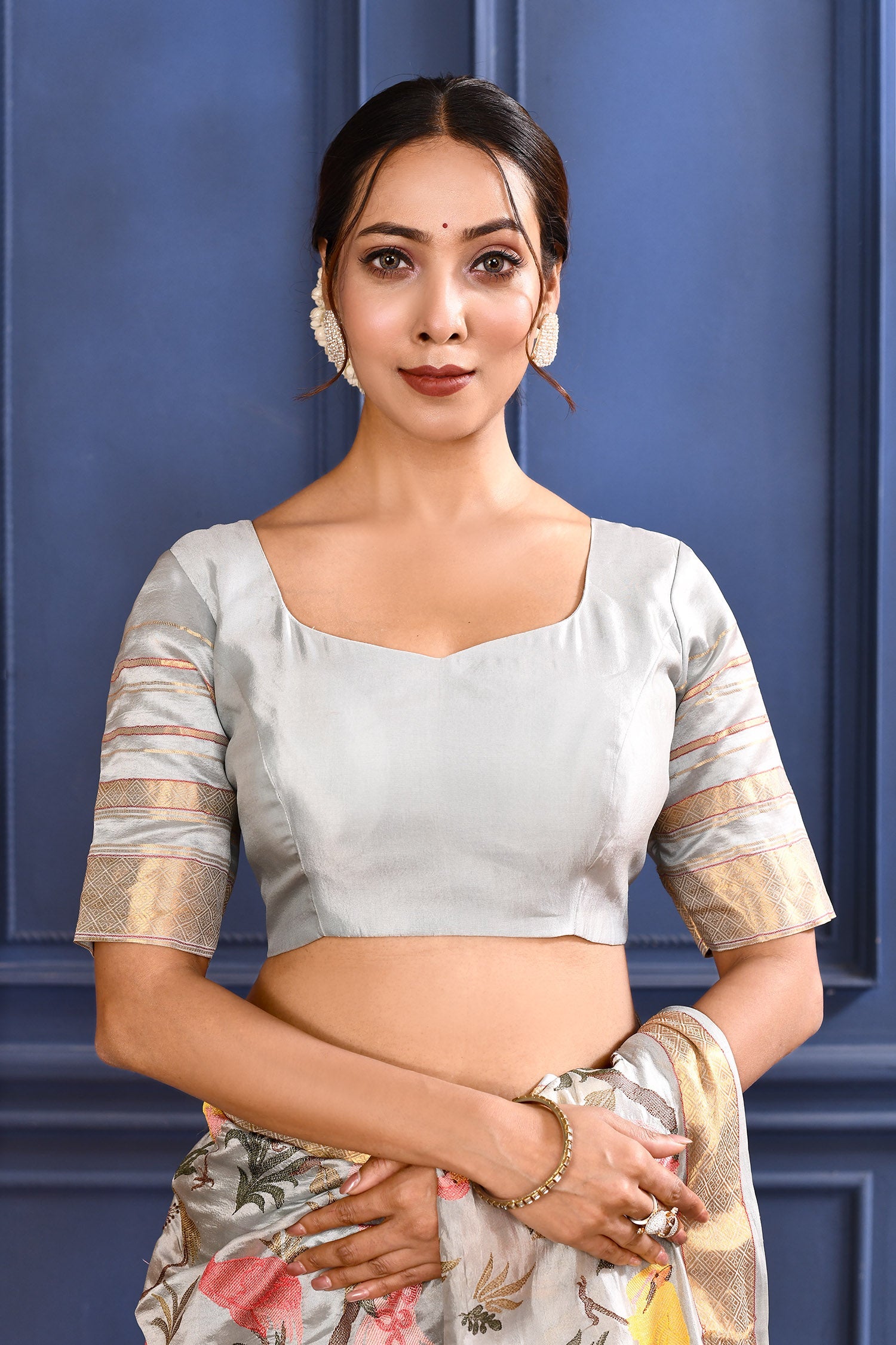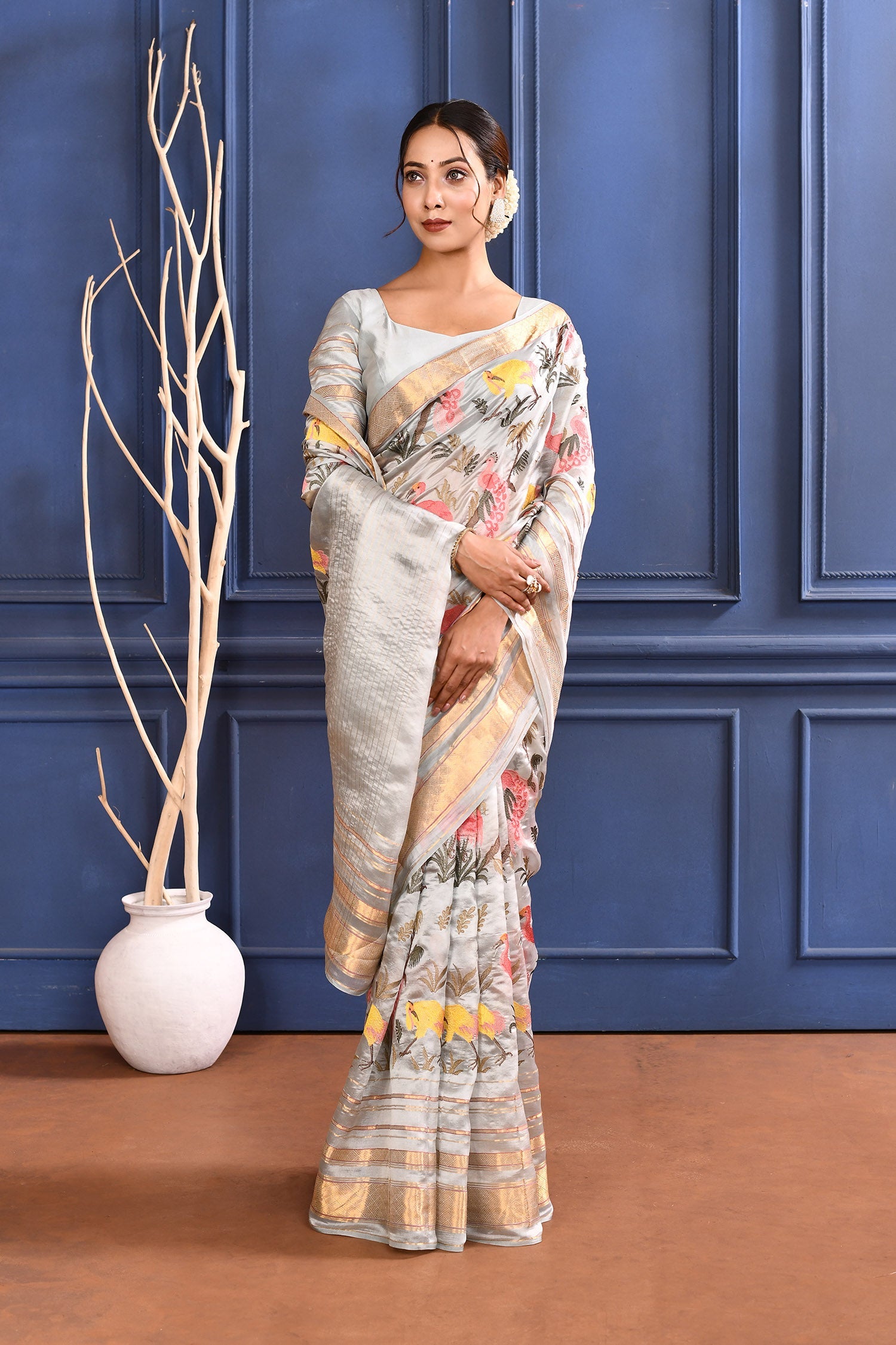 The silver silk saree with floral and bird embroidery and woven zari border along with matching blouse for a graceful traditional look.