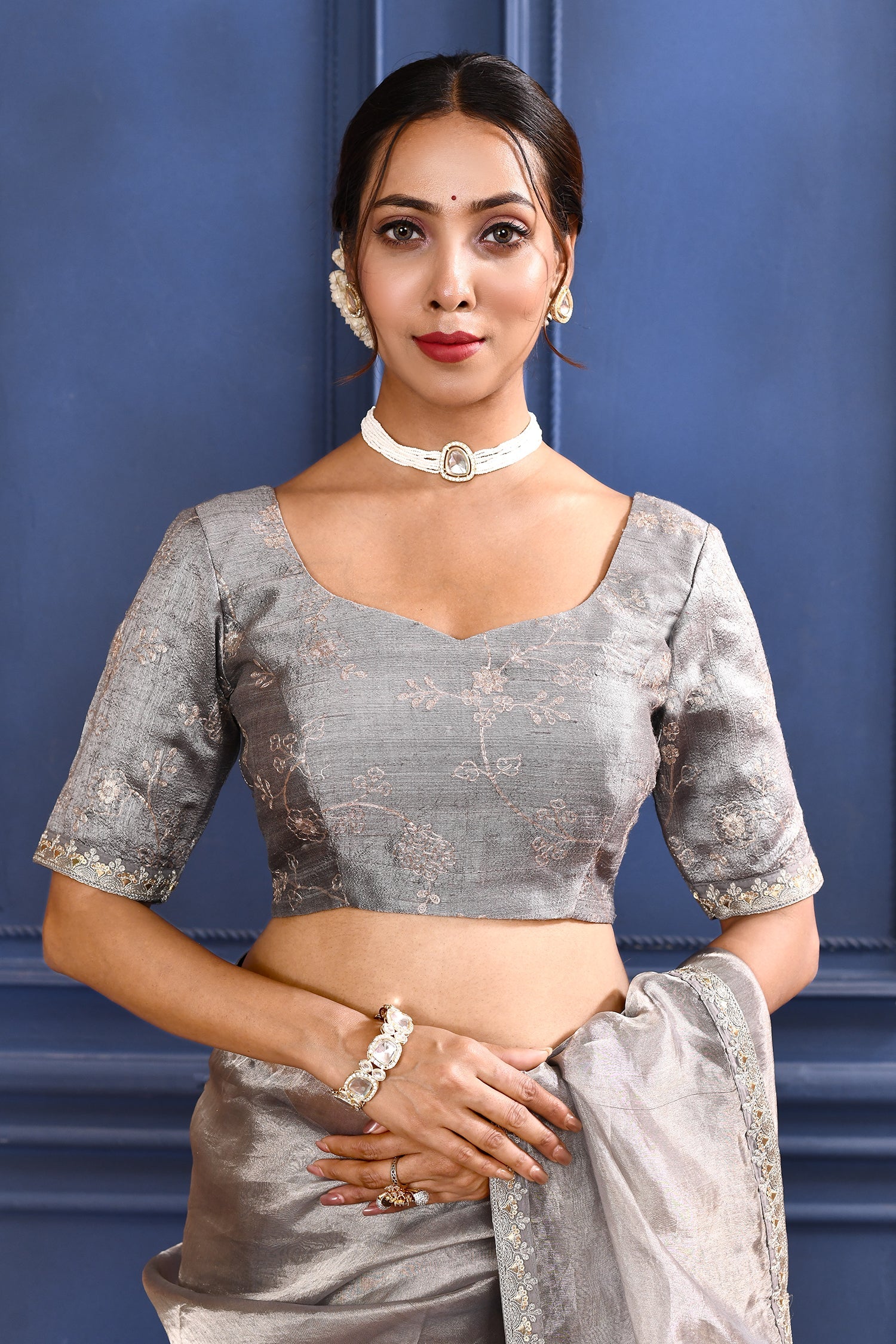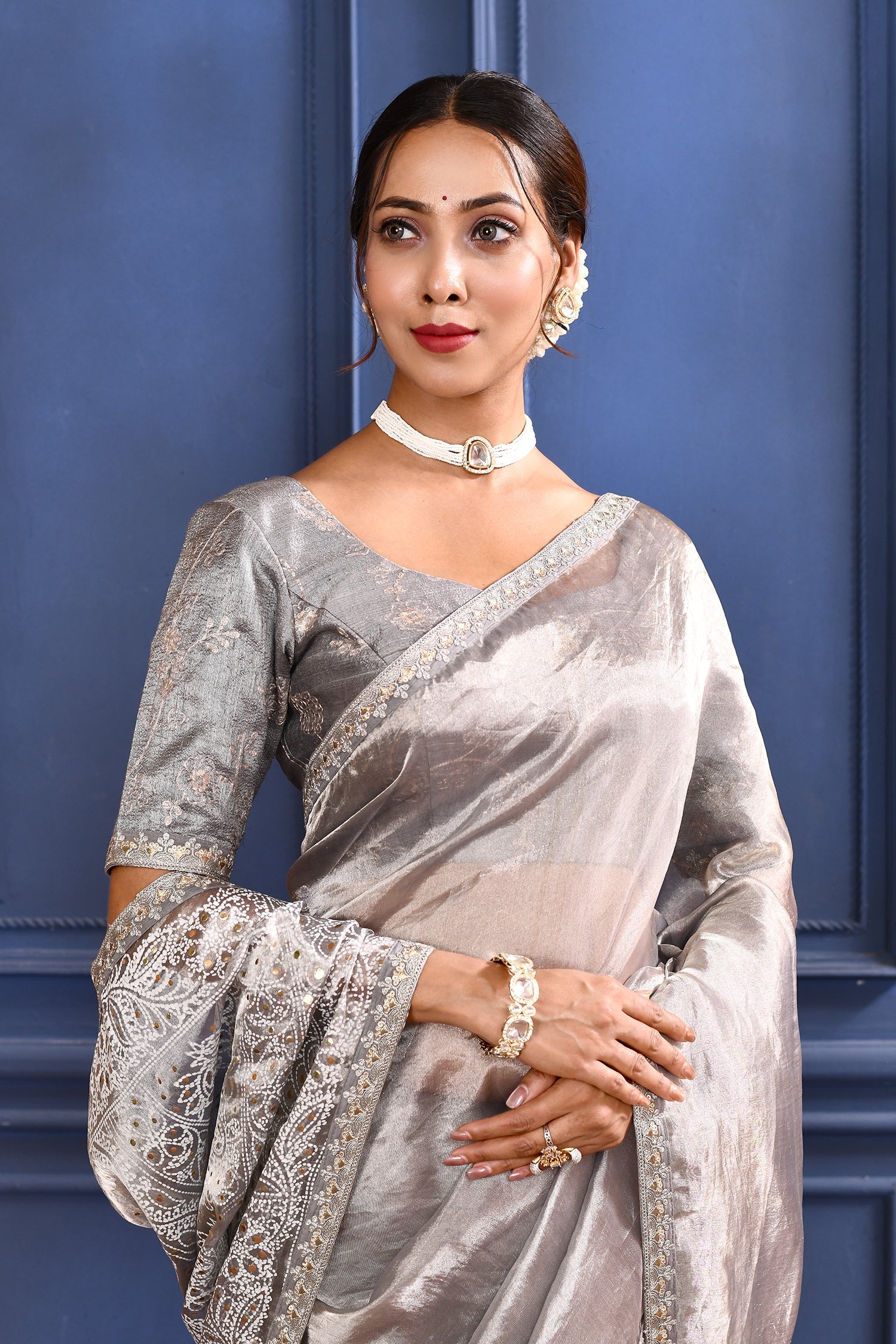 The silver foil printed tissue saree with embroidered self border and blouse for a rich look along with foil printed floral design for subtle grace.