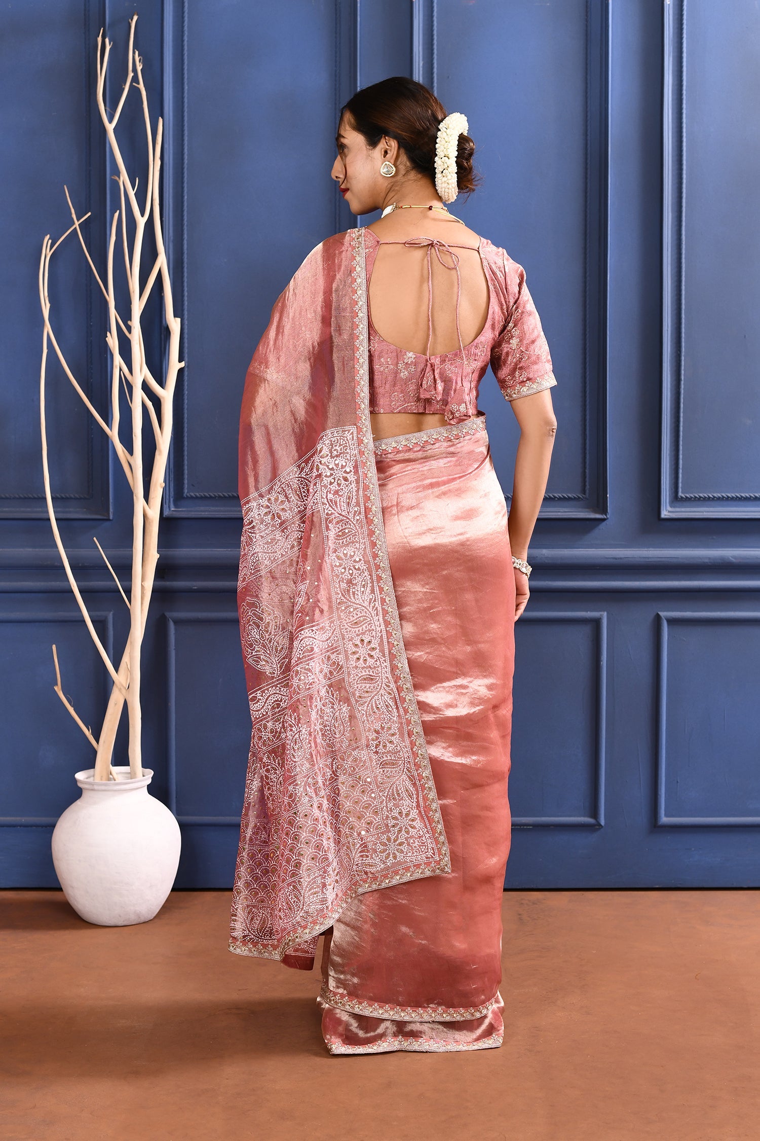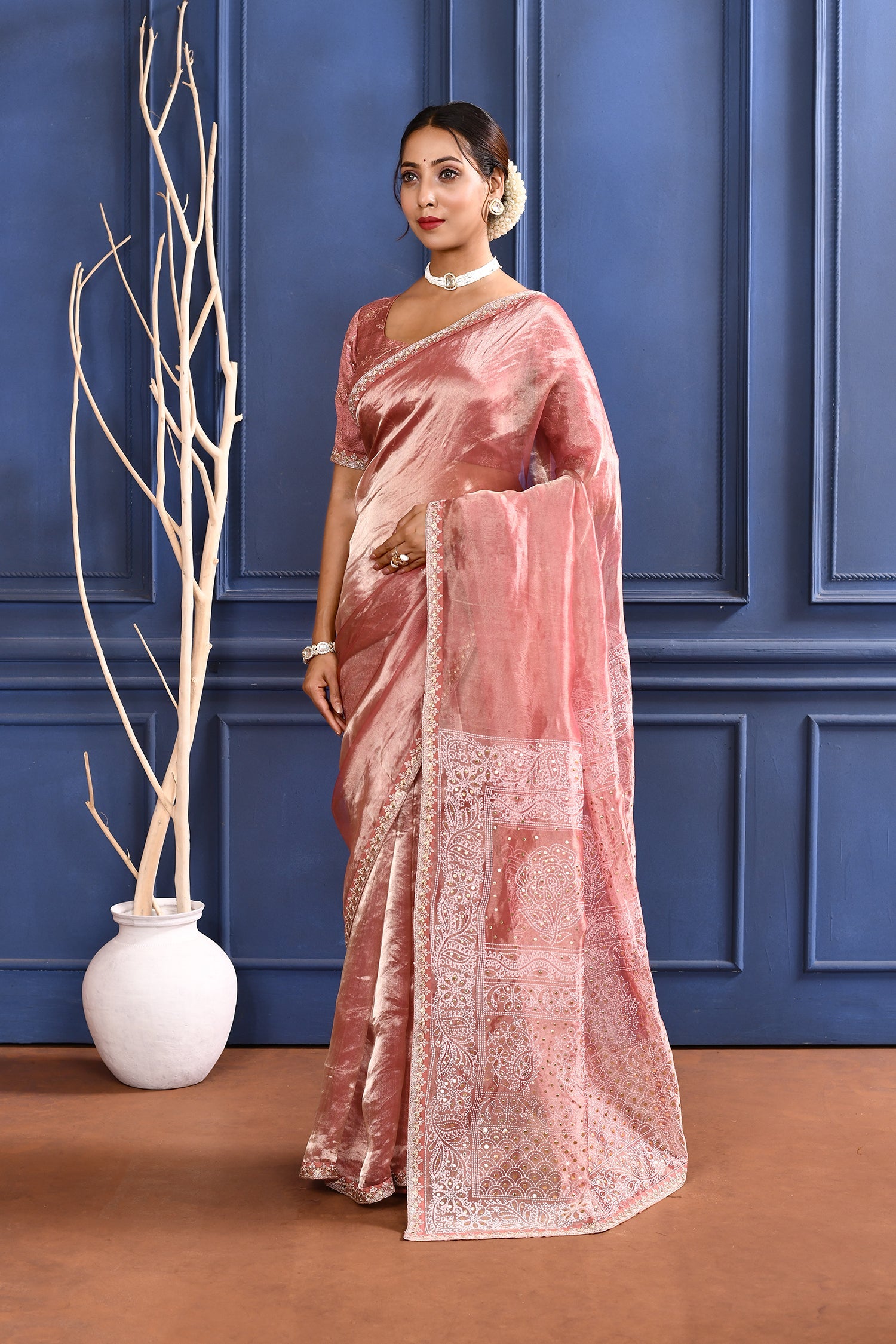 The soft pink foil printed tissue saree with embroidered self border and blouse for a rich look along with foil printed floral design for subtle grace.