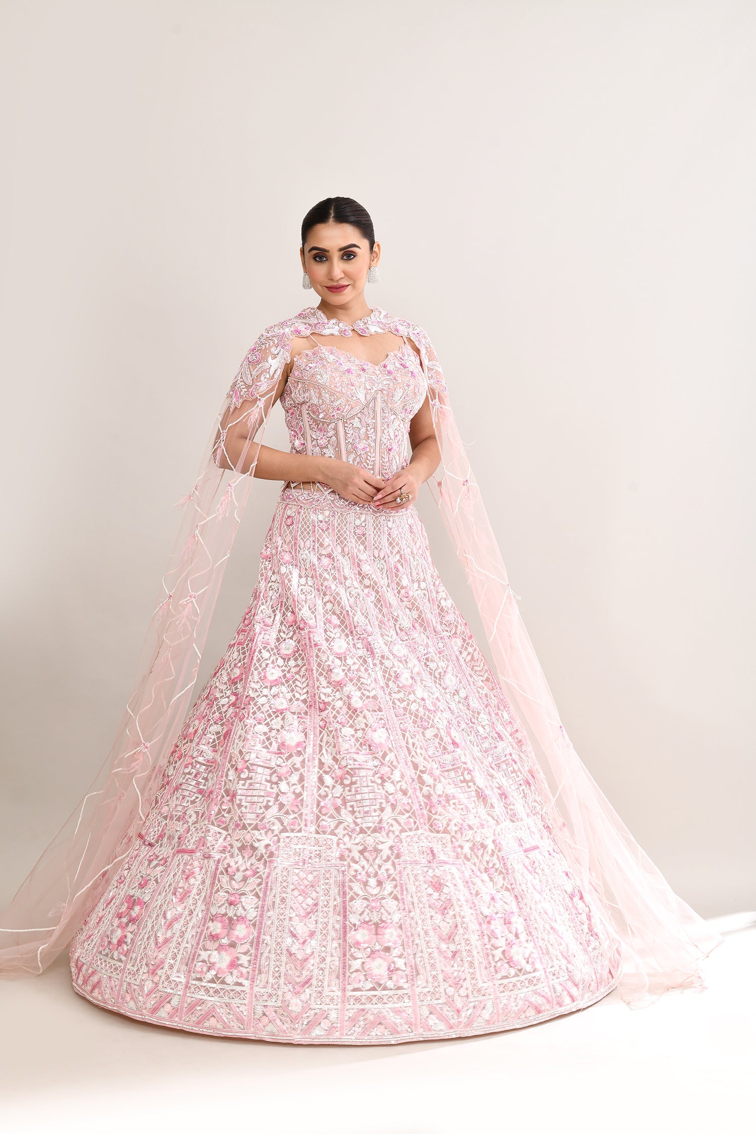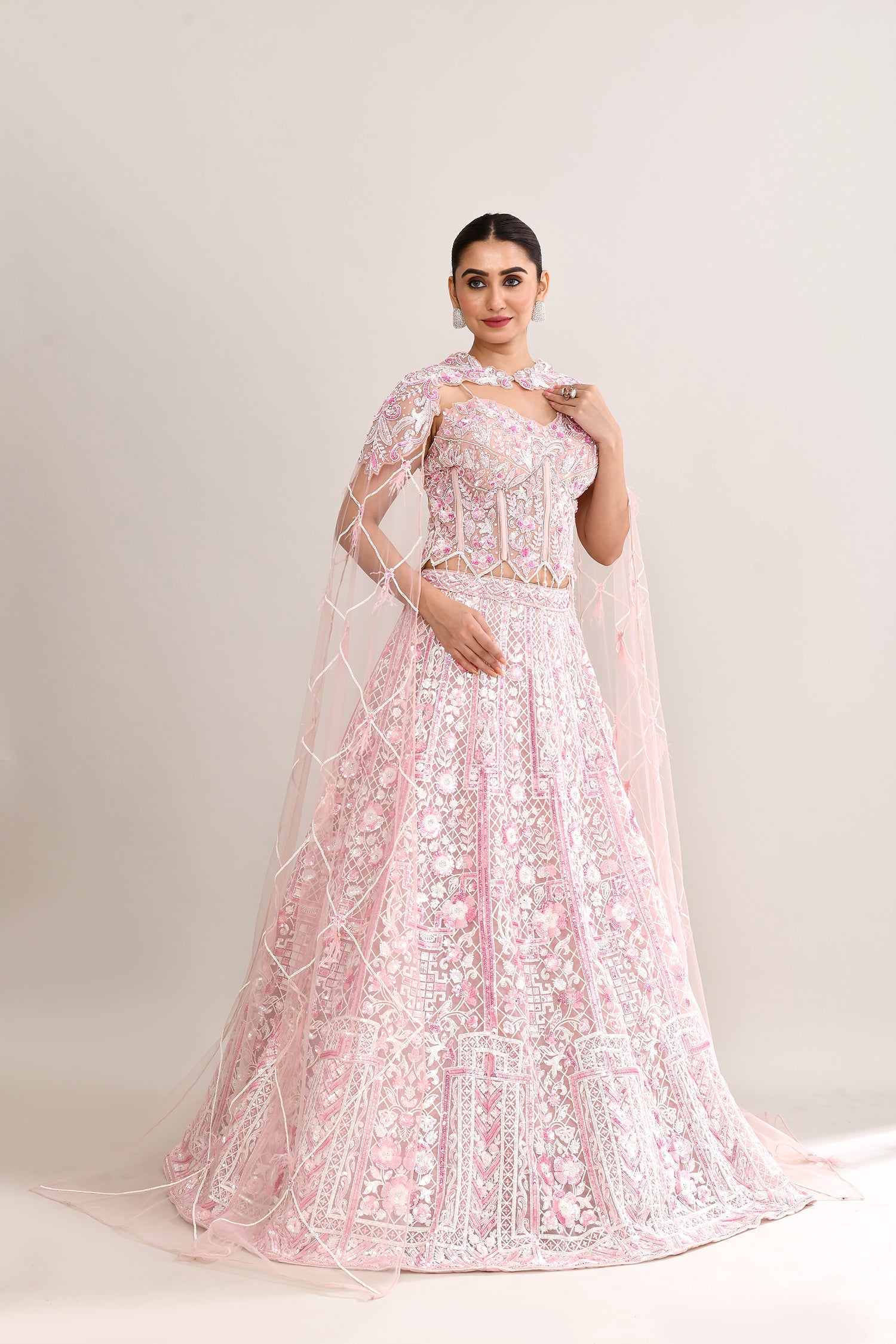 The soft pink net lehenga set with hand embroidered pearl and sequin work along with a choker cape style dupatta for a gorgeous look with elegance.