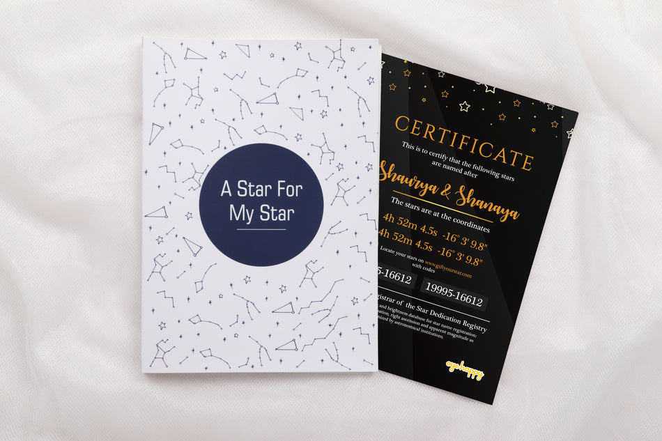 The stars are customized with the name of the special person and a constellation chart with the location of the stars. You can also add a personalized message to it.