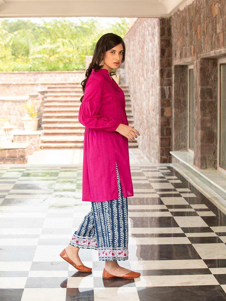 A flowy fuchsia modal dyed shirt kurta featuring dense pintucks all over its bodice and sleeves giving it a gorgeous structure and style. A versatile shirt that can be seamlessly paired with Indian and western bottoms or worn as a dress. Our model is 5'6" and wearing S.