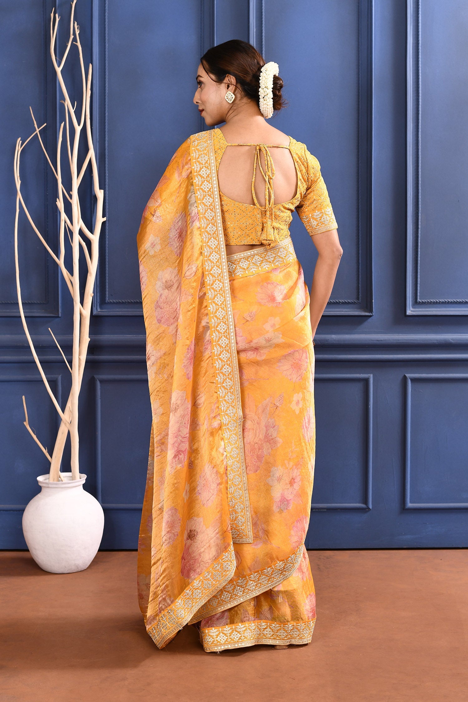 Turmeric Yellow Floral Printed Tissue Saree