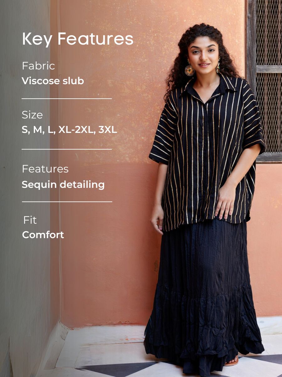 - How to style: Complete the look with a black crinkled skirt or black trousers or a black pair of shorts and statement earrings