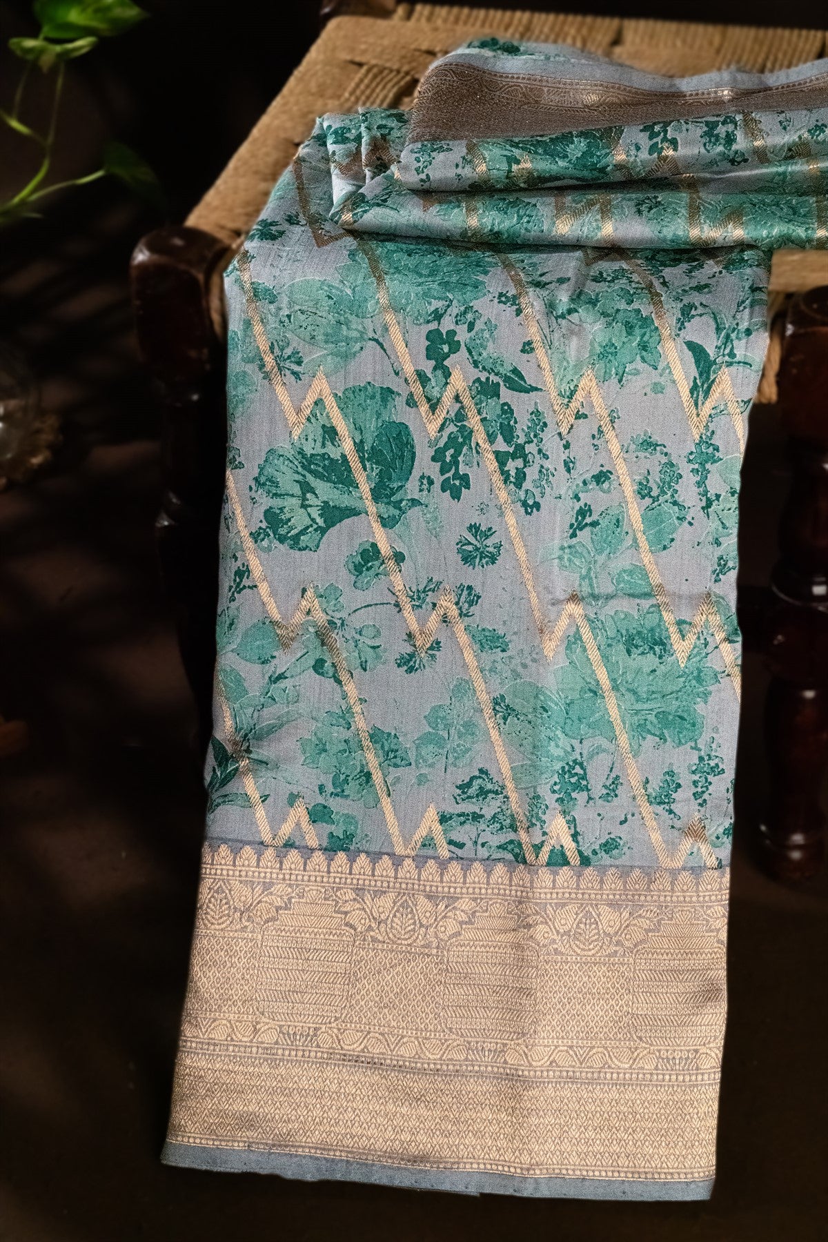 Varamahalakshmi Light Grey & Green Matka Cross Lines Saree