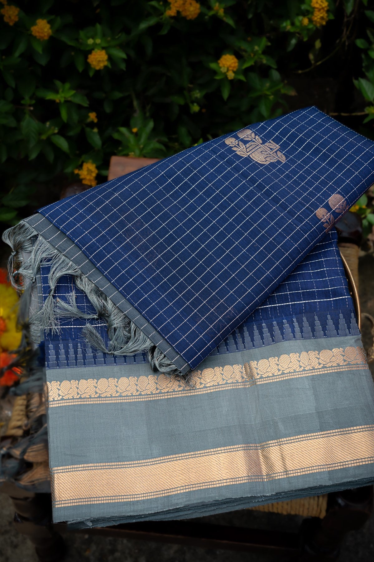 Varamahalakshmi Navy Blue & Grey Kuppadam Checks And Buttis Saree