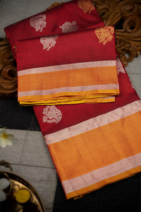 Make a statement at your next event with this beautiful maroon colored Kalamandir silk saree.