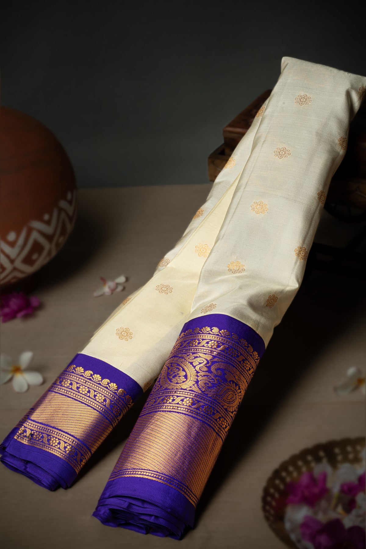 Varamahalakshmi Cream & Royal Blue Gadwal Buttis Saree