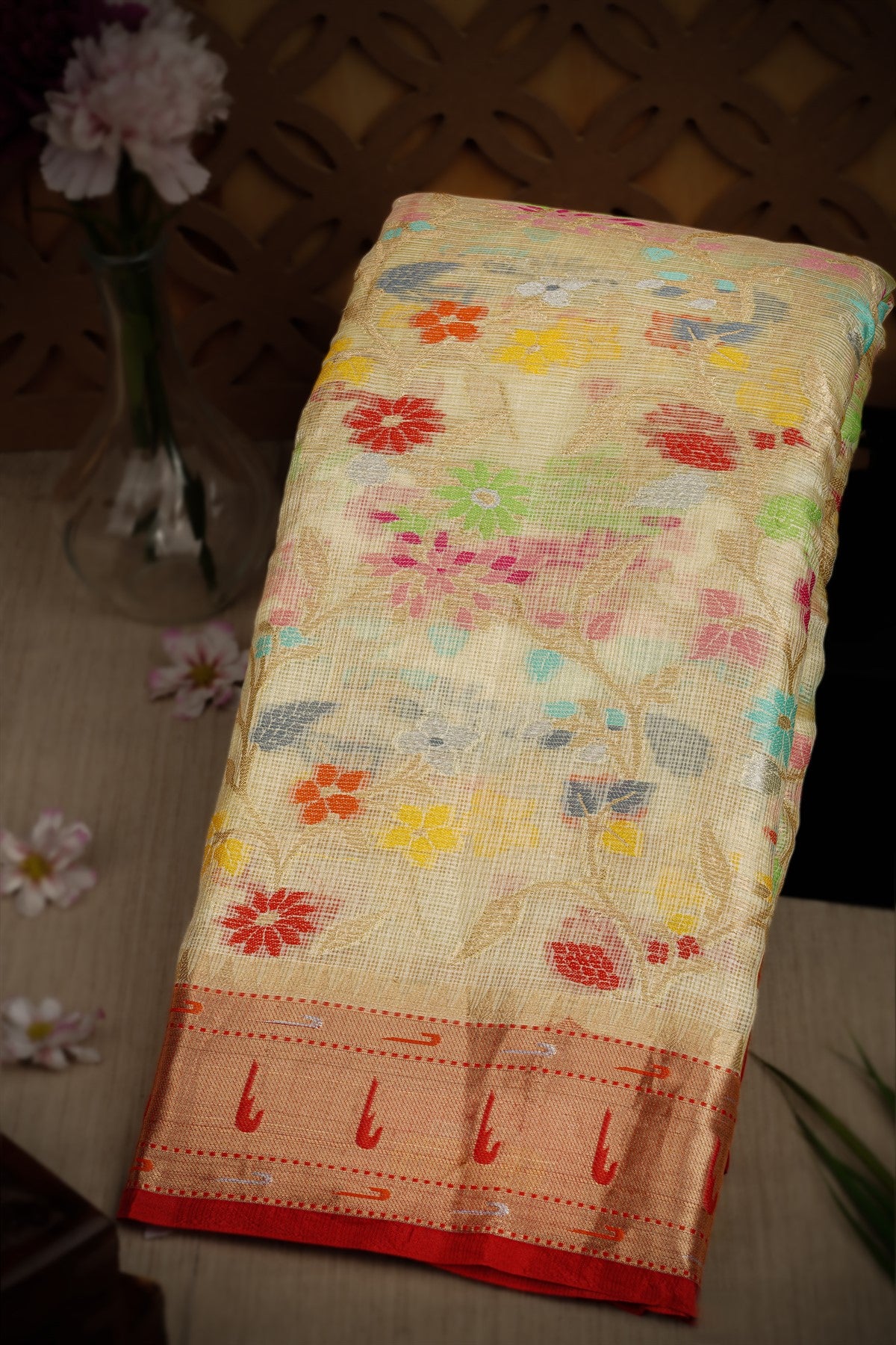 Varamahalakshmi Cream & Red Fancy Floral Jaal Saree