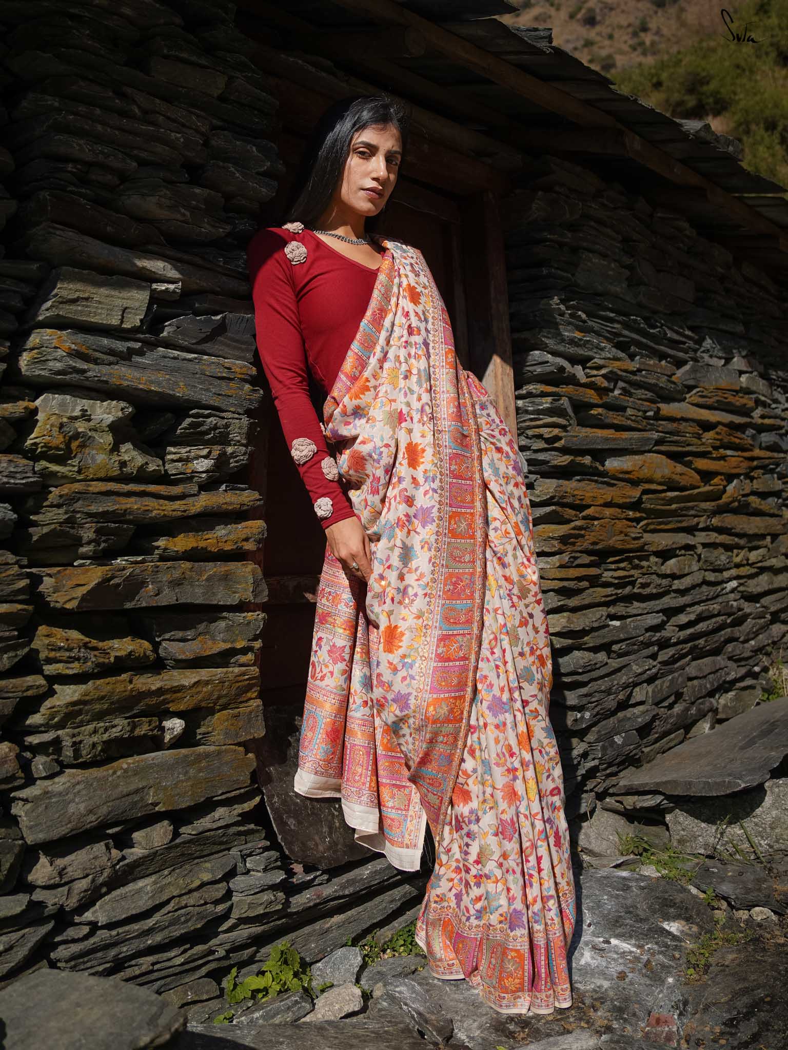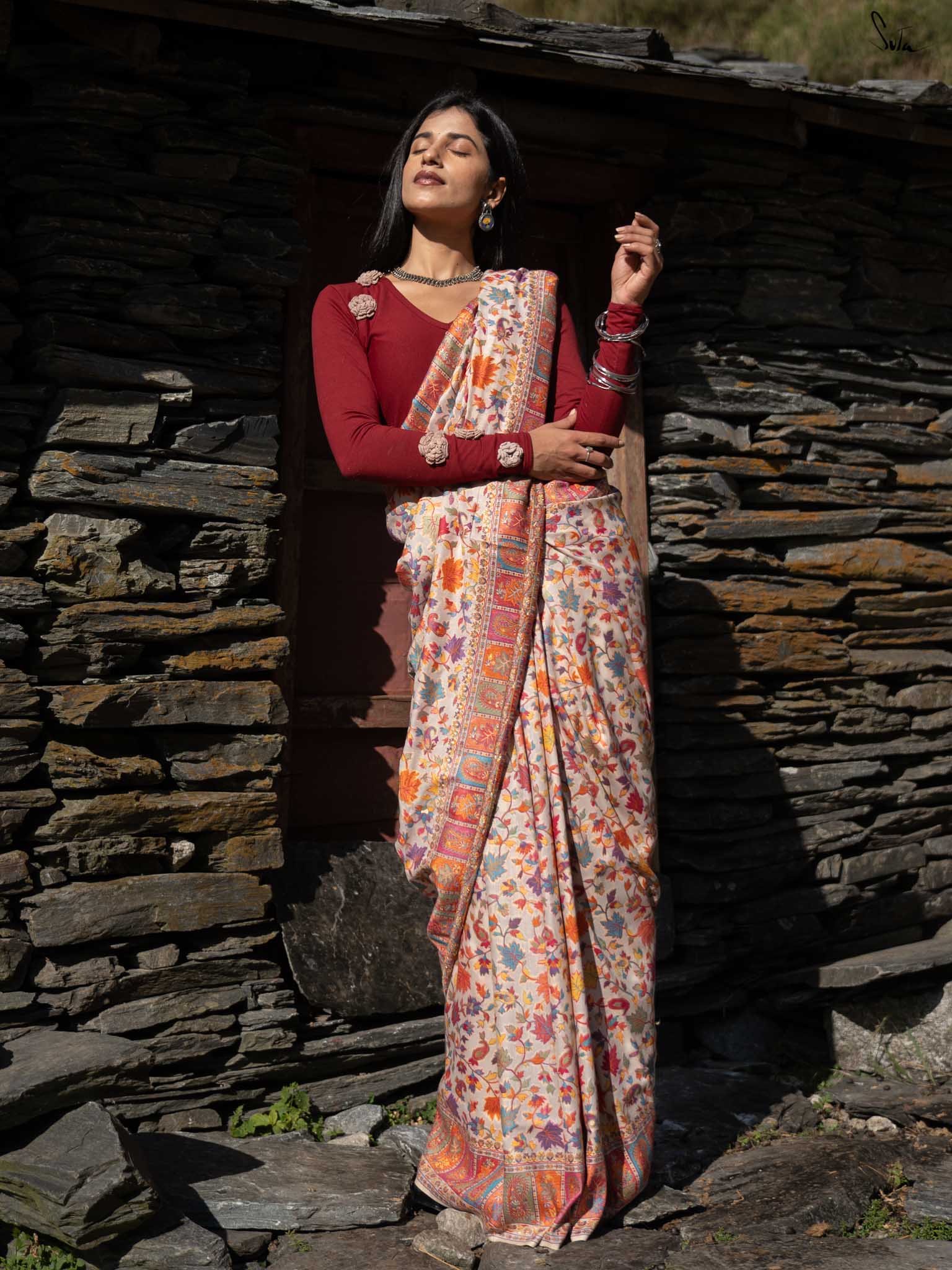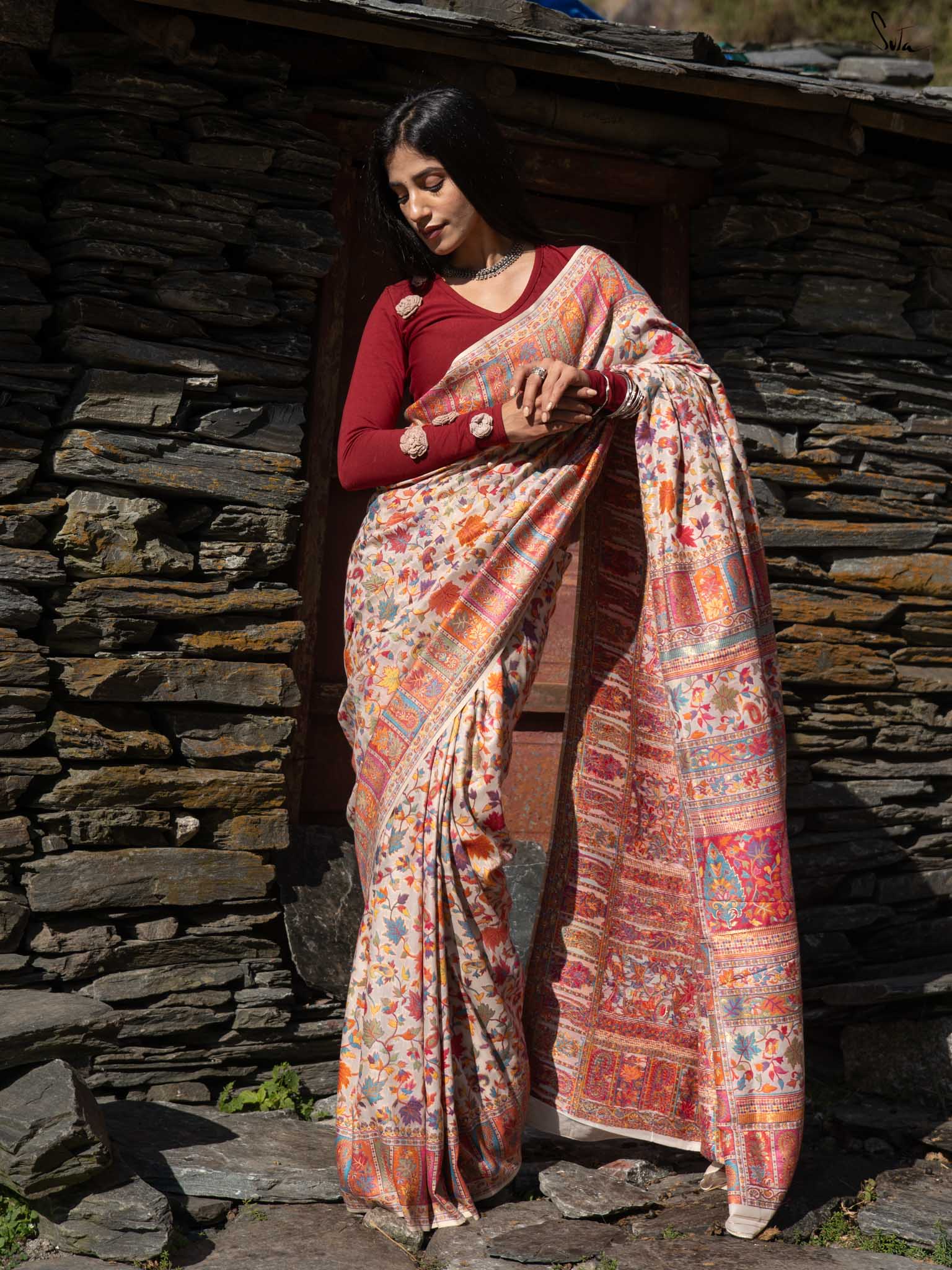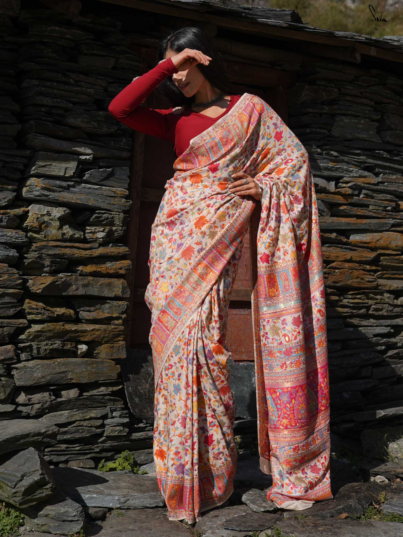 The off-white base is brought to life with colourful woven motifs, like flowers blooming in the valleys. Soft, calm, and quietly radiant -this saree captures the peaceful beauty of the Himalayas.