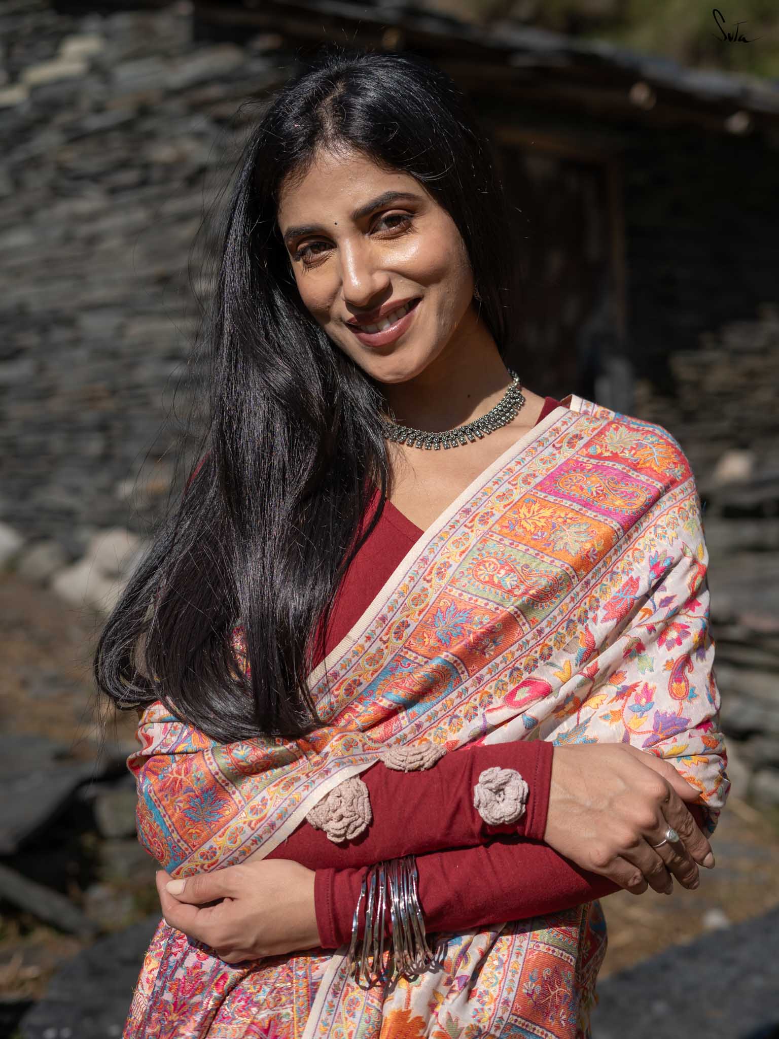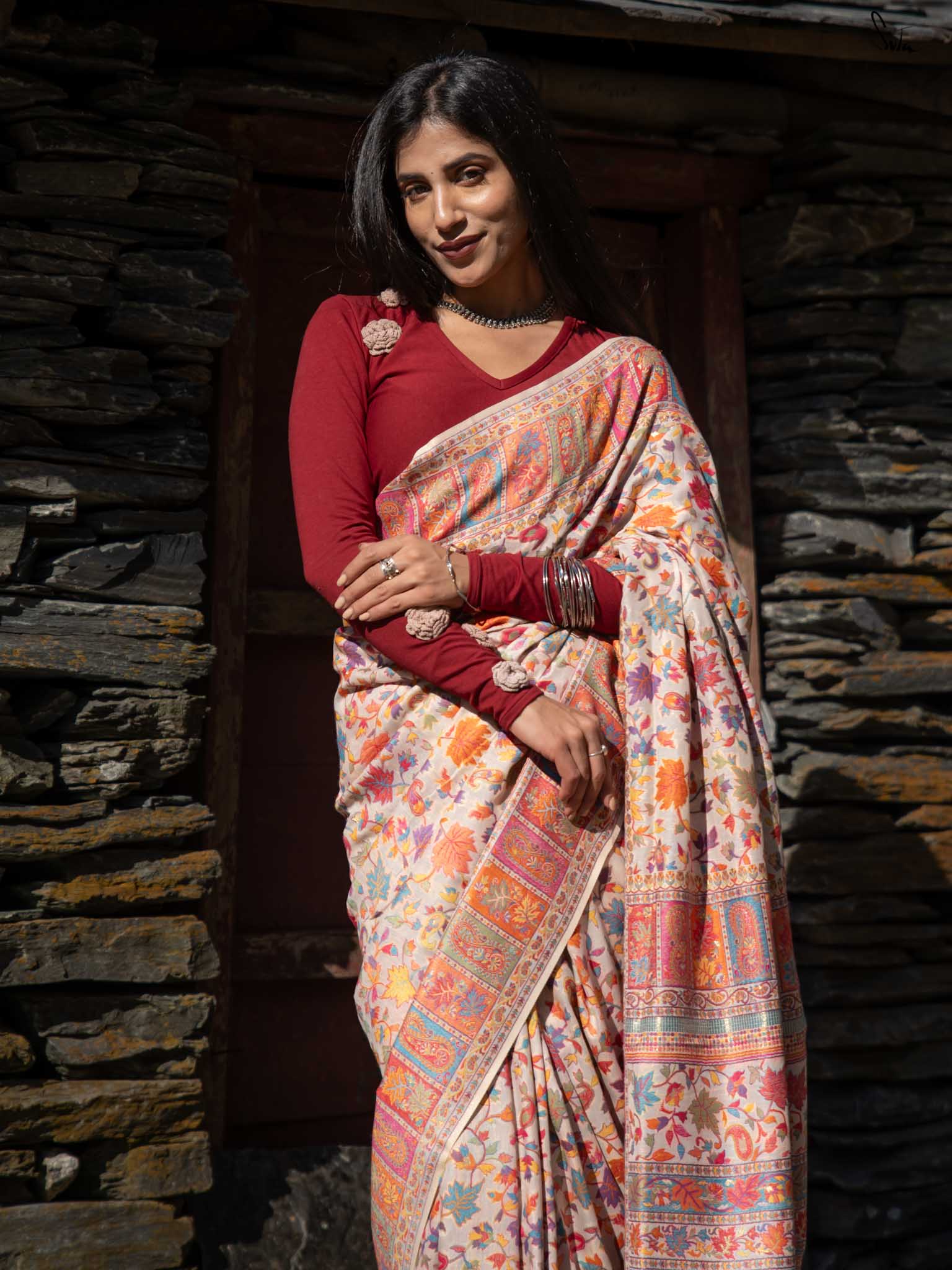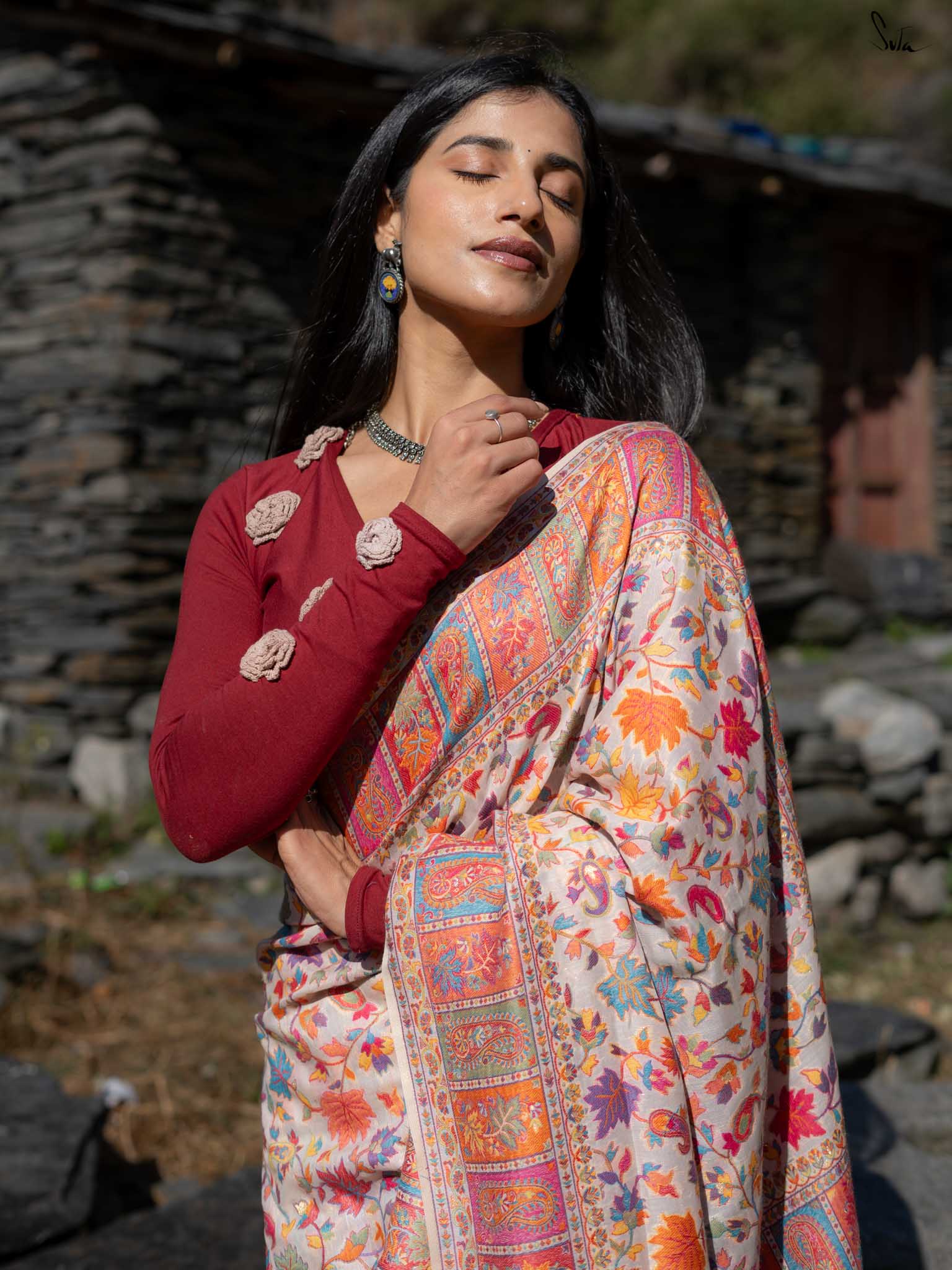 The off-white base is brought to life with colourful woven motifs, like flowers blooming in the valleys. Soft, calm, and quietly radiant -this saree captures the peaceful beauty of the Himalayas.