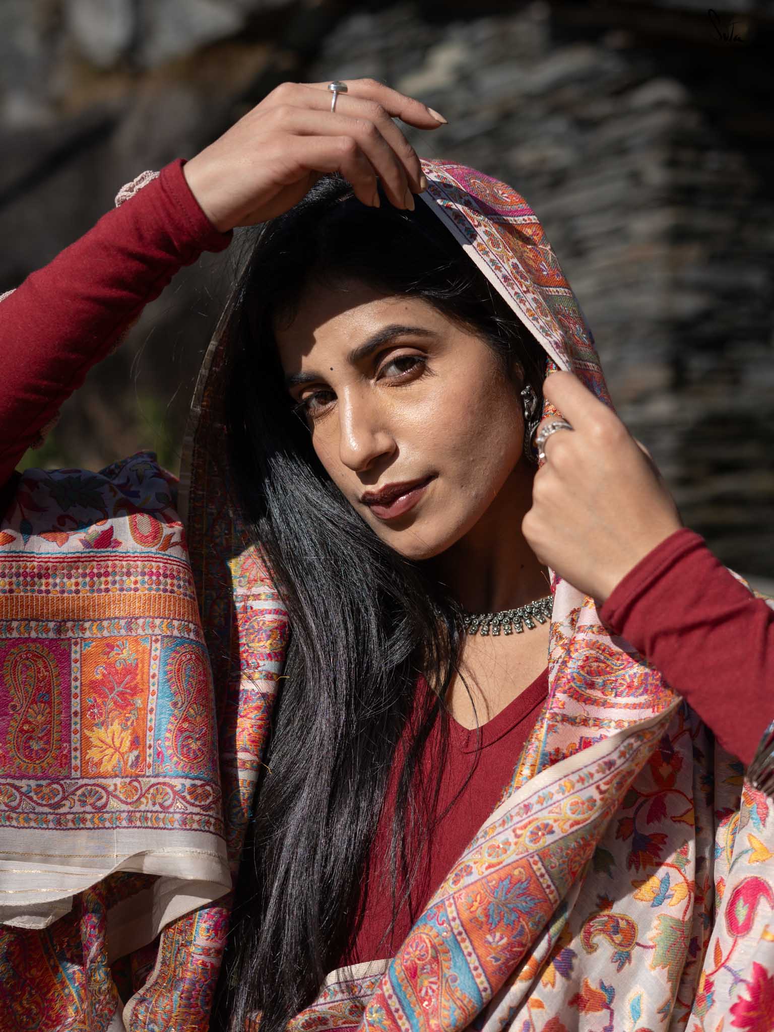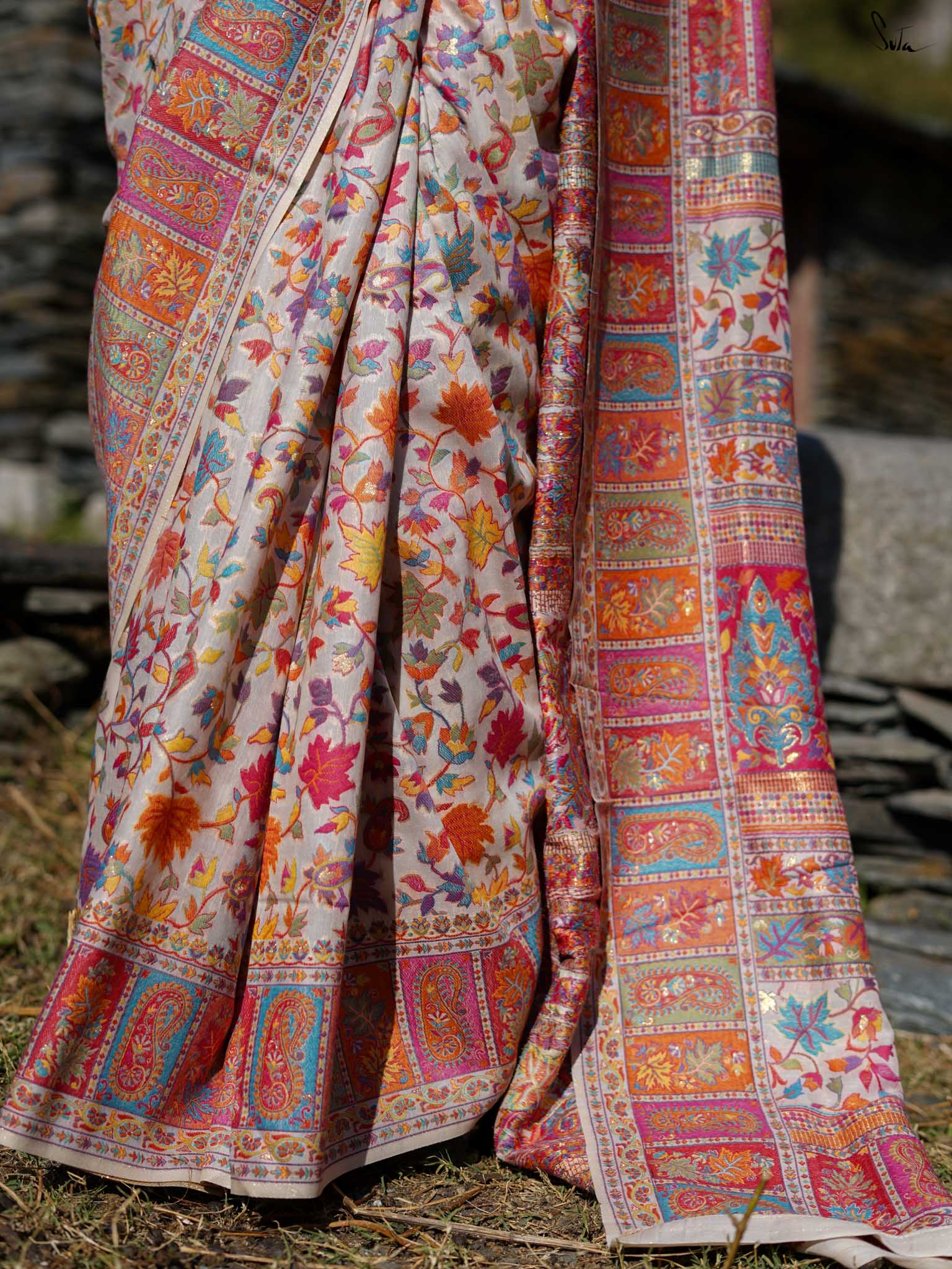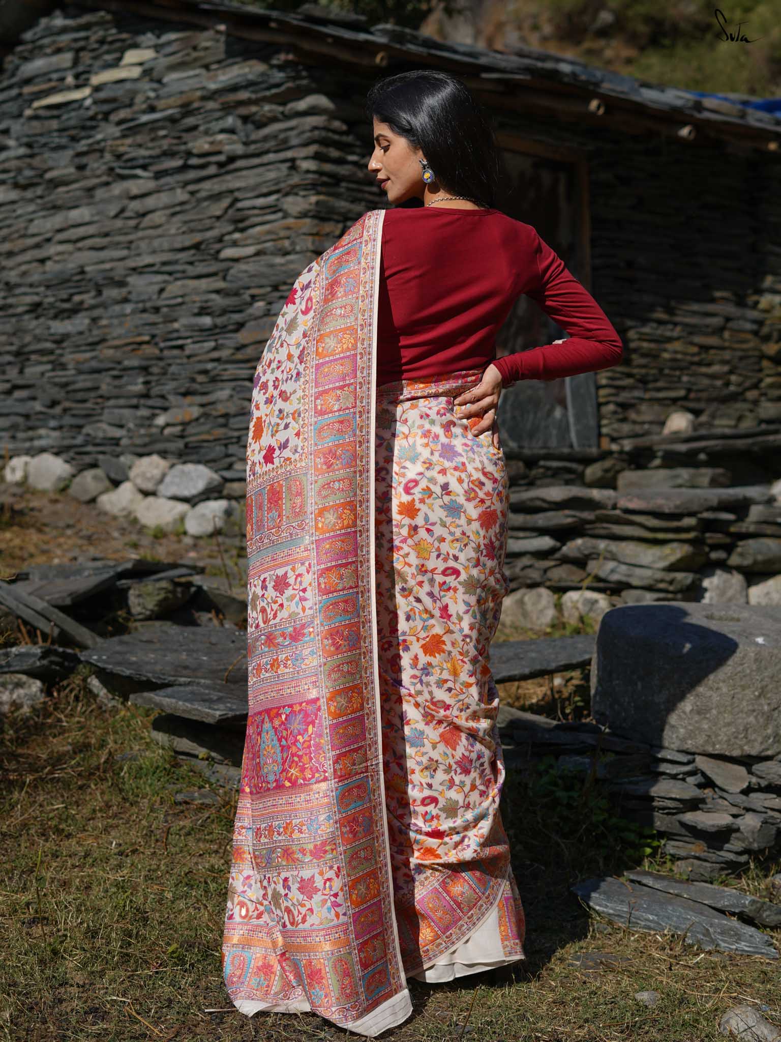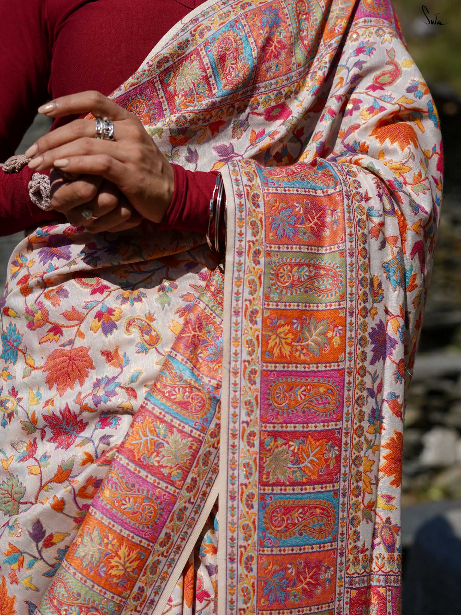 The off-white base is brought to life with colourful woven motifs, like flowers blooming in the valleys. Soft, calm, and quietly radiant -this saree captures the peaceful beauty of the Himalayas.